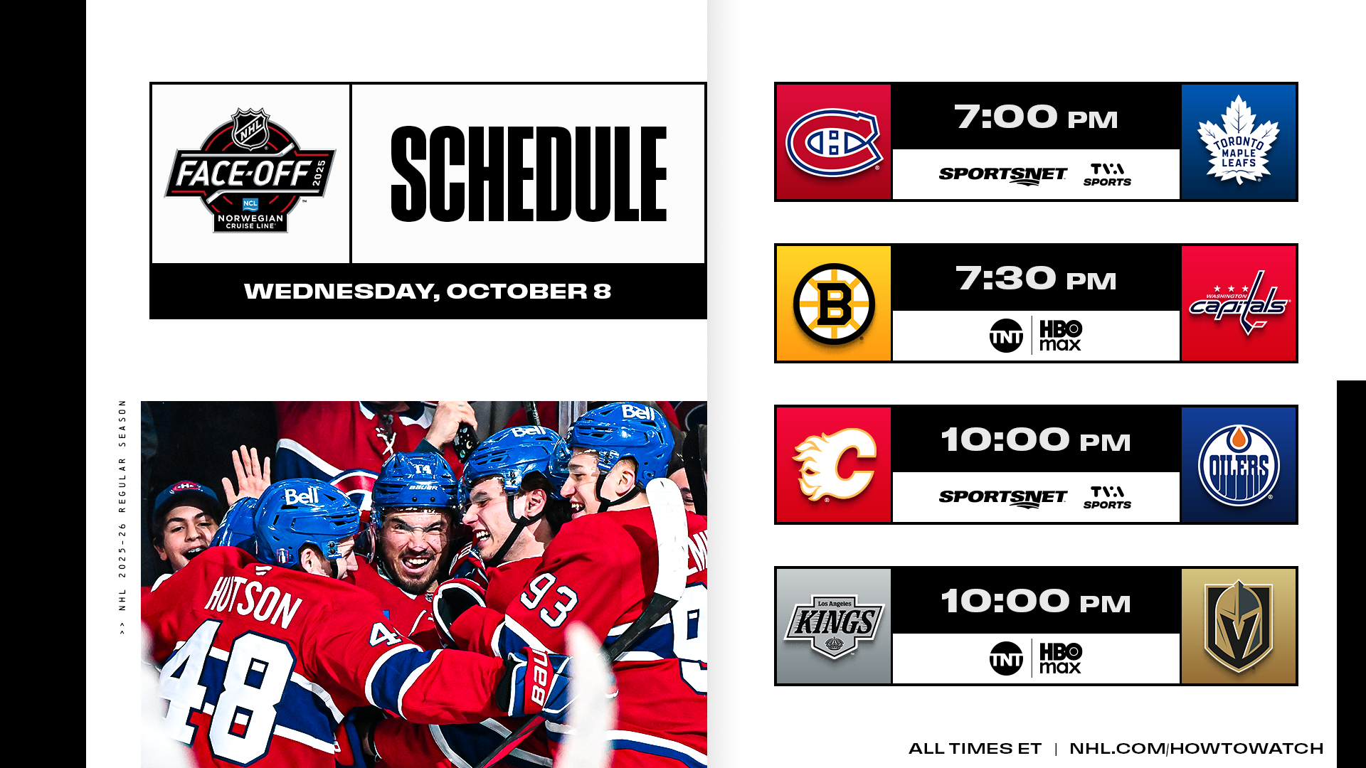 * A four-game night features a pair of all-Canadian matchups to open the regular season in Canada on Sportsnet as the Maple Leafs face the Canadiens and the Oilers battle the Flames, while NHL on TNT opens their coverage of 2025-26 with the Bruins visiting the Capitals and the Golden Knights clashing with the Kings.
