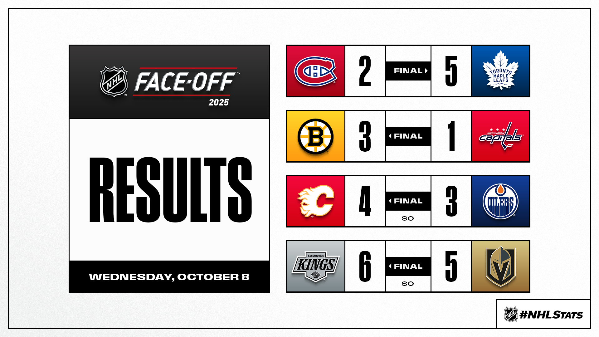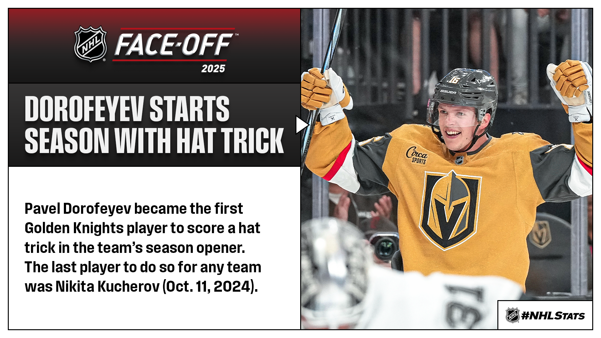 The second #NHLStats: Live Updates of the season featured a number of notes on Golden Knights forward Pavel Dorofeyev (3-0—3), who scored the NHL’s first hat trick of 2025-26, as well as David Pastrnak, who tallied 1-2—3 in the Bruins’ victory. It also included coverage of Alex Ovechkin, who walked the red carpet ahead of his home opener with Sunny Thornton, a four-year-old pediatric cancer patient currently undergoing treatment, to help the Capitals captain re-launch THE GR8 CHASE for Victory Over Cancer. Click here for more on his initiative that has raised $165,000 and counting.