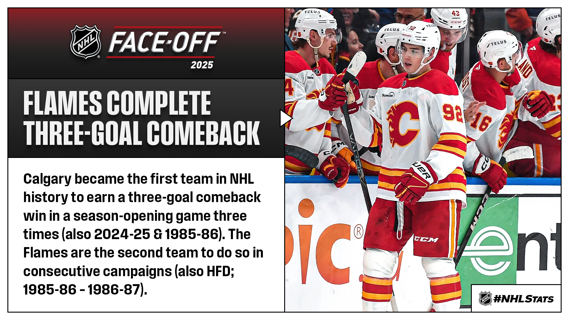 * Gridin, who was selected by the Flames 28th overall in the 2024 NHL Draft and spent last season skating with the Shawinigan Cataractes in the QMJHL, became the fourth teenager in franchise history to score in his NHL debut, joining Zayne Parekh (April 17, 2025), Jarome Iginla (Oct. 5, 1996) and Brian Glynn (Oct. 8, 1987). He helped Calgary record its second three-goal comeback win in the ‘Battle of Alberta’ during the regular season (also March 26, 2011), the most by either team.