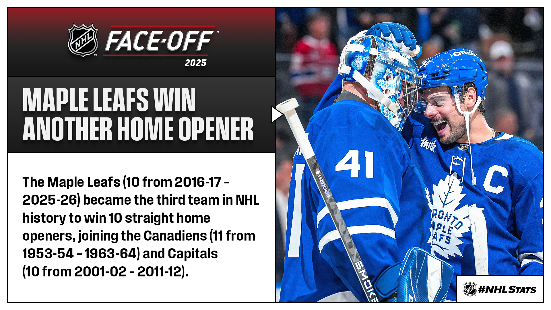 MAPLE LEAFS WIN 10TH STRAIGHT HOME OPENER
