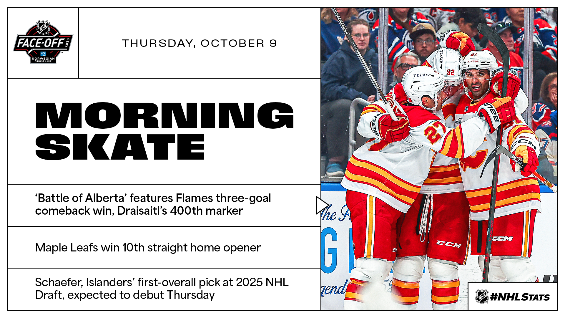 The second day of the 2025-26 regular season concluded with the Flames completing a three-goal comeback win in the ‘Battle of Alberta’ during a contest that featured Matvei Gridin score in his NHL debut and Leon Draisaitl reach the 400-goal milestone. In another Pacific Division matchup, it was the Kings who outlasted the Golden Knights in a contest that saw both clubs overcome a multi-goal deficit.