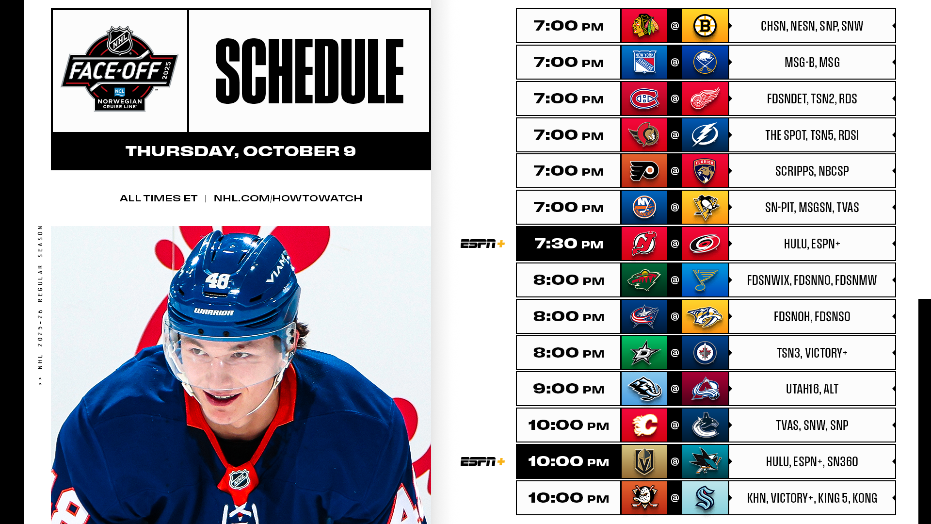 The first two ESPN+ exclusive games of the season open with a First Round playoff rematch between the Hurricanes and Devils (CAR: 4-1) followed by a Pacific Division showdown between the Golden Knights and Sharks. The Devils were without Jack Hughes in the 2025 Stanley Cup Playoffs due to injury, but the star forward is slated to suit up for his first game since March 2. He will do so alongside brother Luke Hughes, a defenseman who signed a seven-year extension prior to the season. The two participated in Team USA’s Olympic orientation camp prior to the season alongside sibling Quinn Hughes, who has already been named to the team and will also make his season debut tonight as captain of the Canucks.