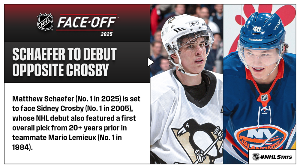 * One of Schaefer’s first experiences in the NHL will be lining up opposite another high-profile first-overall pick selected 20 years earlier in Penguins forward Sidney Crosby. Crosby is skating in his 21st season, a campaign that will see him suit up for Team Canada again at the Olympic Winter Games Milano Cortina 2026 and continue to chase history – he needs 37 points to pass Mario Lemieux (1,723) for the most in franchise history and for eighth place on the League’s all-time list as well as two assists to leapfrog Steve Yzerman (1,063) for the ninth most in NHL history.