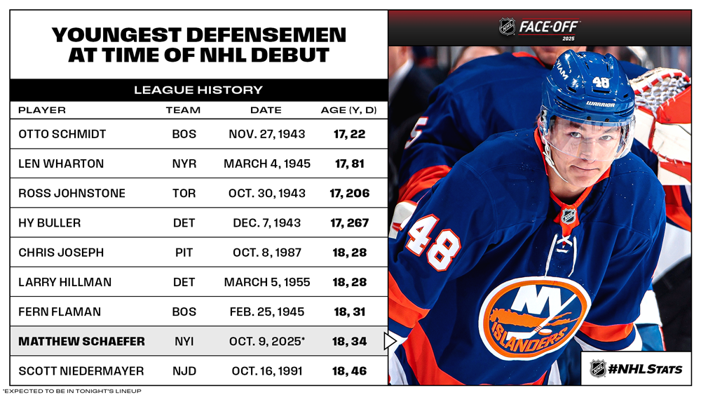 * Matthew Schaefer, the Islanders’ first-overall pick in the 2025 NHL Draft, is expected to make his highly anticipated NHL debut on a 14-game Thursday. That would put Schaefer in the top 10 in NHL history for youngest defensemen at the time of his debut.
