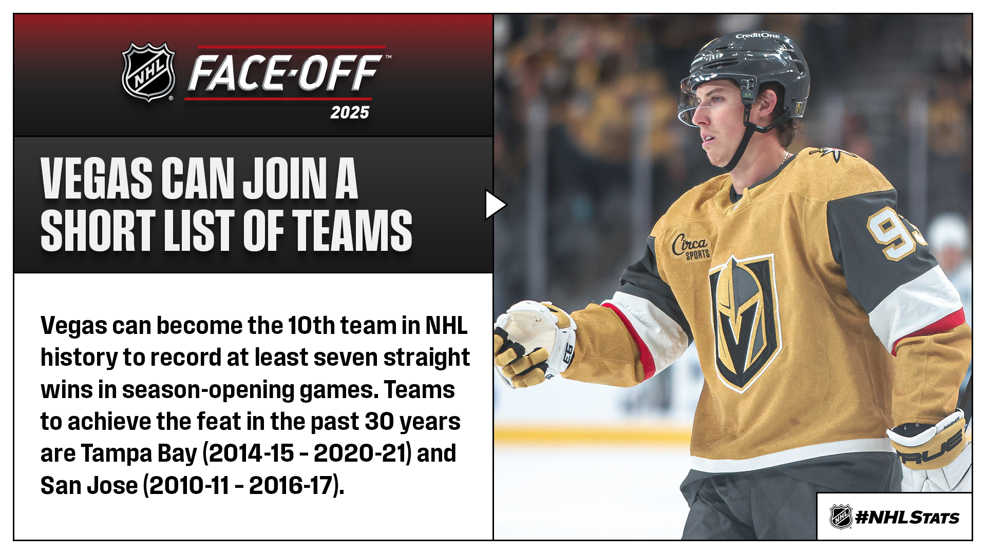* The Golden Knights usher in the season with a new offensive threat in their lineup as Marner makes his Vegas debut on the heels of his first career 100-point season. He joins a Golden Knights team that has had historic success in season-opening contests, with wins in each of their past six such contests dating to 2019-20. Overall, the club (7-1-0, .875 P%) owns the highest points percentage in League history (min. 2 GP).