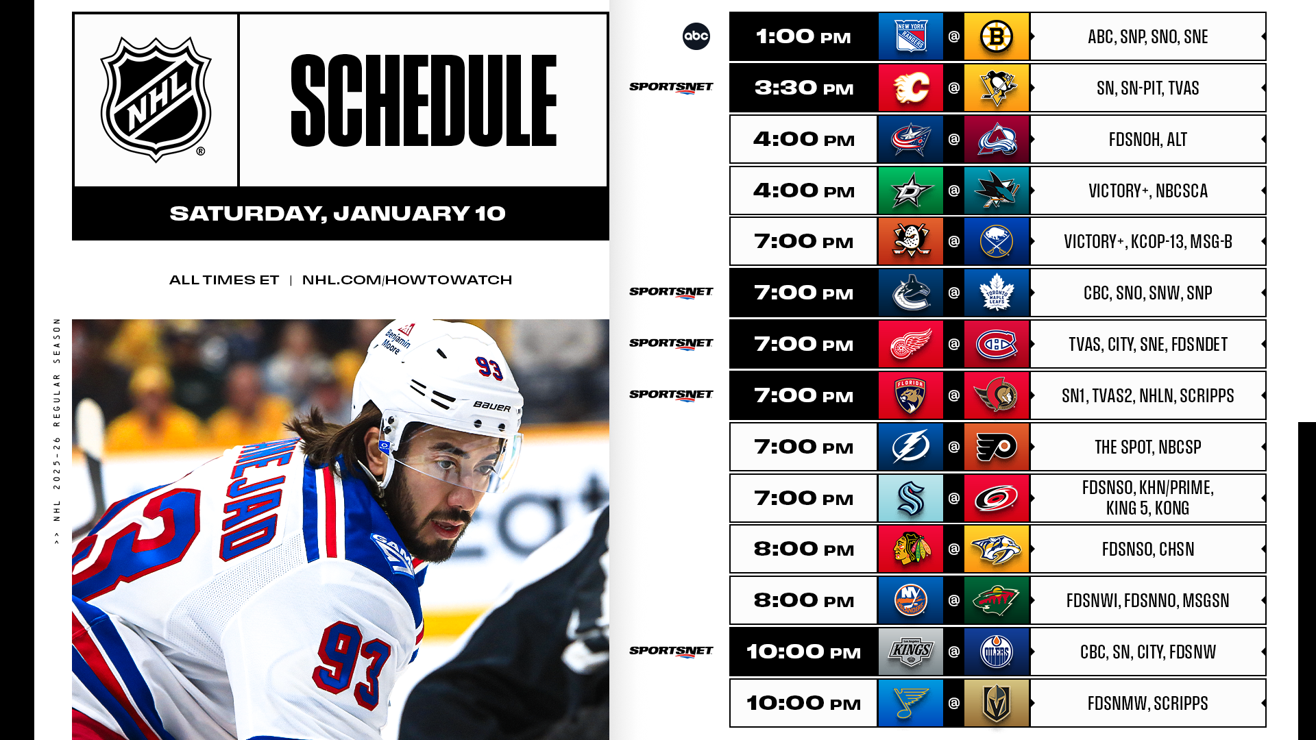* A jam-packed 14-game slate features the Rangers and Bruins on ABC Hockey Saturday as well as a four-pack on Hockey Night in Canada, which closes with Connor McDavid looking to hit the 80-point mark.