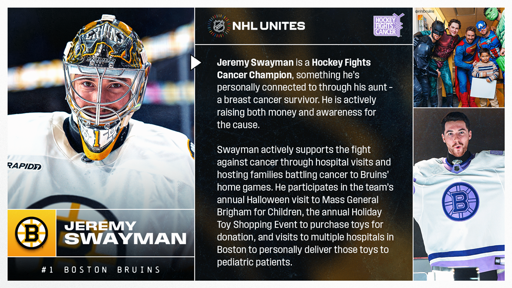 * Jeremy Swayman, who could tend Boston’s crease Saturday, is another Bruins player set to skate in the Olympic Winter Games Milano Cortina 2026 for Team USA. Swayman is a Hockey Fights Cancer Champion who is making an impact in the space of cancer research and in the lives of families battling cancer. His impact can be felt beyond the ice.