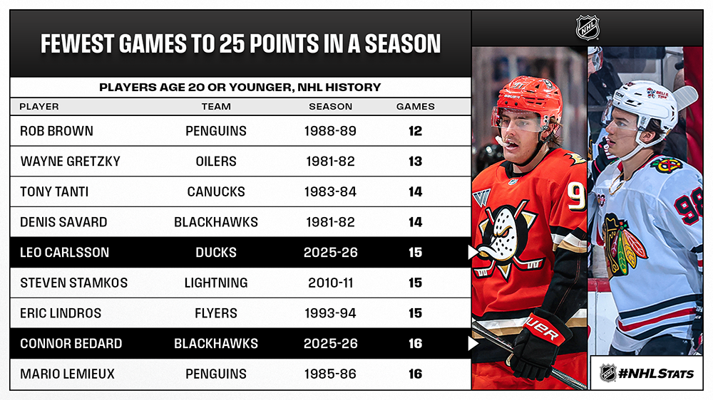 * Carlsson scored two of Anaheim’s four goals to help the Ducks extend their winning streak to seven games – their longest since 2021-22 (8 GP from Oct. 31 – Nov. 16, 2021). Carlsson, who became the second Swedish player in NHL history to record a 10-game point streak at age 20 or younger (also William Nylander: 12 GP in 2016-17), boosted his 2025-26 totals to 10-15—25 (15 GP) and became the fastest player in Ducks history to 25 points in a season – Teemu Selanne previously held the distinction (17 GP in 1995-96).