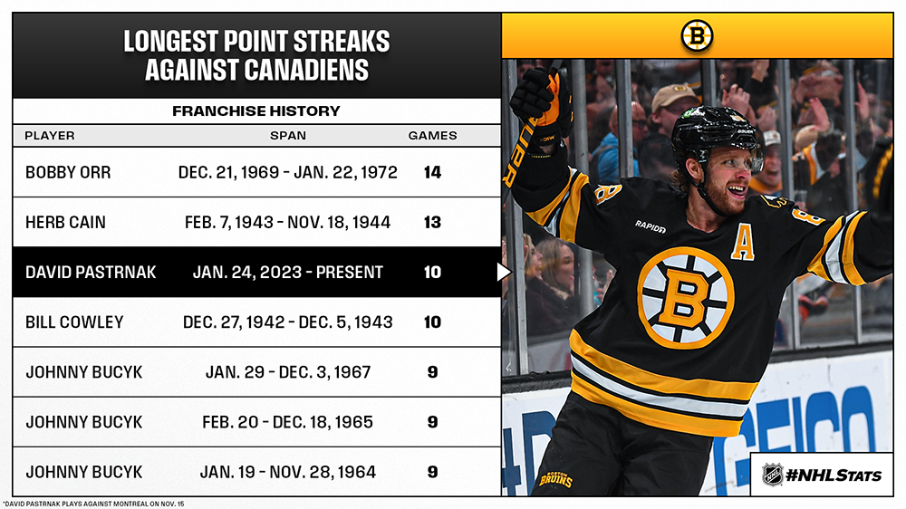 - Bruins at Canadiens on Sportsnet and TVA Sports (Saturday): David Pastrnak, who has helped Boston record a six-game winning streak and climb within two points of Atlantic Division-leading Montreal, has found the score sheet in each of his last 10 contests against the Canadiens dating to Jan. 24, 2023. That’s tied for the third longest run by a Bruins player in the 100-year history of the rivalry.