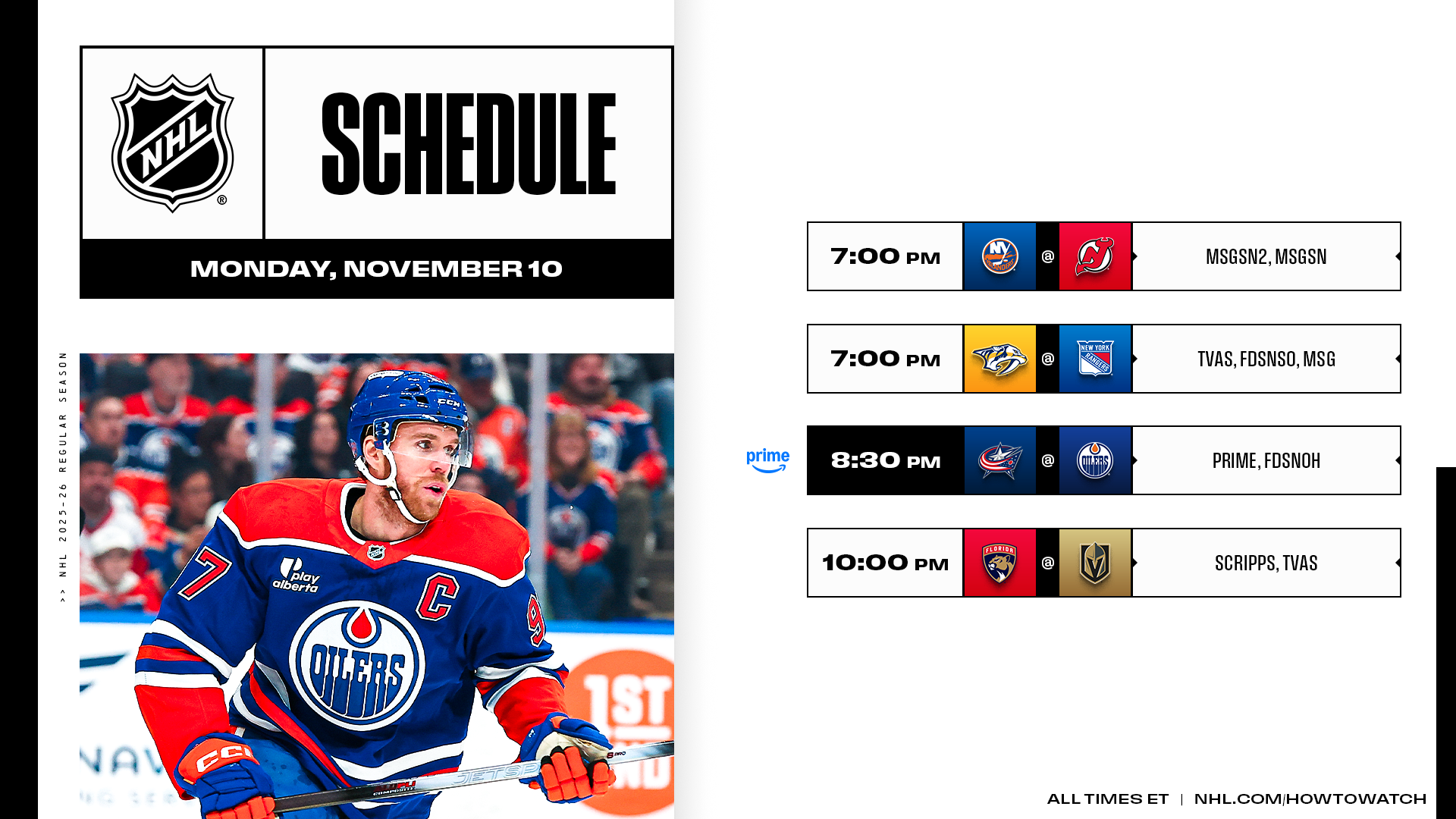 * Prime Monday Night Hockey heads to Edmonton tonight when Connor McDavid and the Oilers host Adam Fantilli and the Blue Jackets in one of several national telecasts slated for the week ahead.