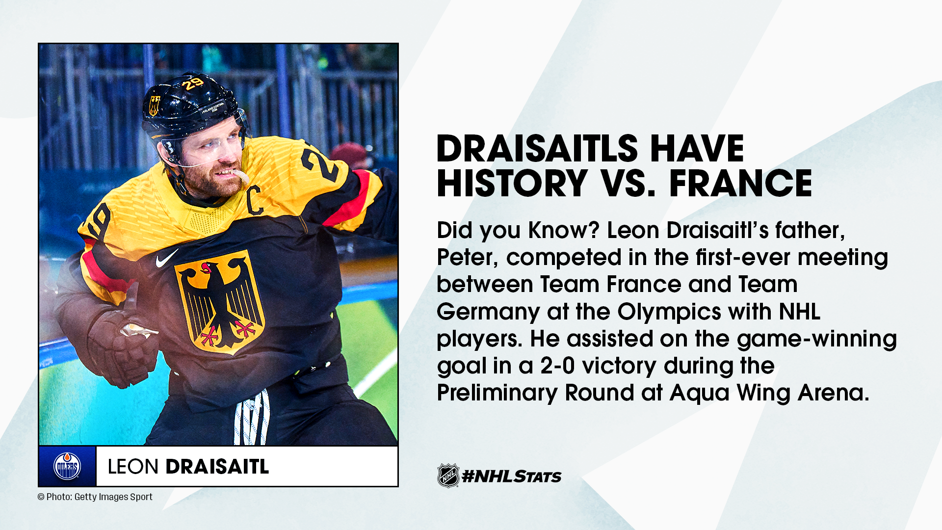 Senators forward Tim Stützle (4-0—4), who shares the tournament lead in goals, and Oilers forward Leon Draisaitl (1-2—3) headline a matchup between Team Germany and Team France in the Qualification Playoffs – the second-ever meeting between the two countries in Olympic Winter Games featuring NHL players (also 1998 PRLM). Team France eyes its first quarterfinals berth including NHL involvement, while Team Germany has its sights on its second (2002 at USA). The winner of this contest will face No. 3 seed Team Slovakia in the quarterfinals.