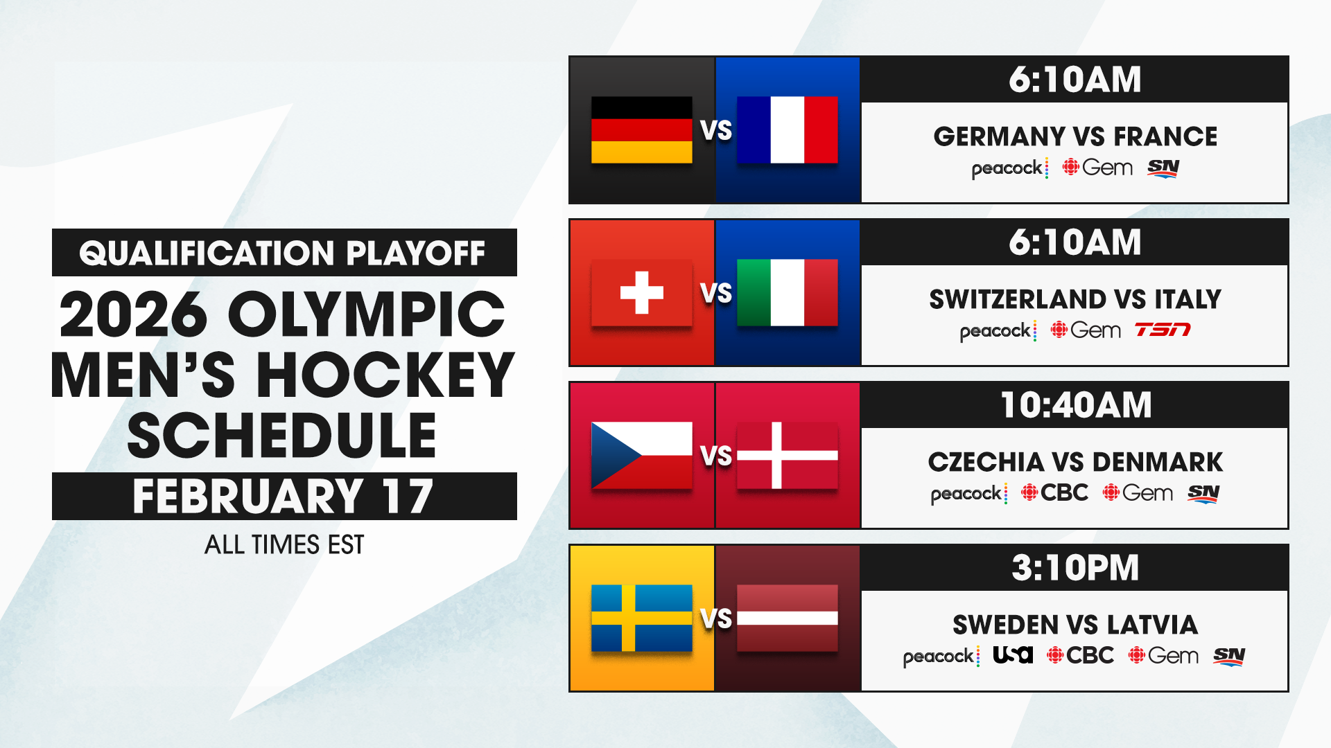 After 18 games and 122 goals during round robin play, eight countries are in action Tuesday during the Qualification Playoffs of the men’s hockey tournament at the Olympic Winter Games Milano Cortina 2026 with a spot in the quarterfinals on the line: Team Germany vs. Team France; Team Switzerland vs. Team Italy; Team Czechia vs. Team Denmark; and Team Sweden vs. Team Latvia.