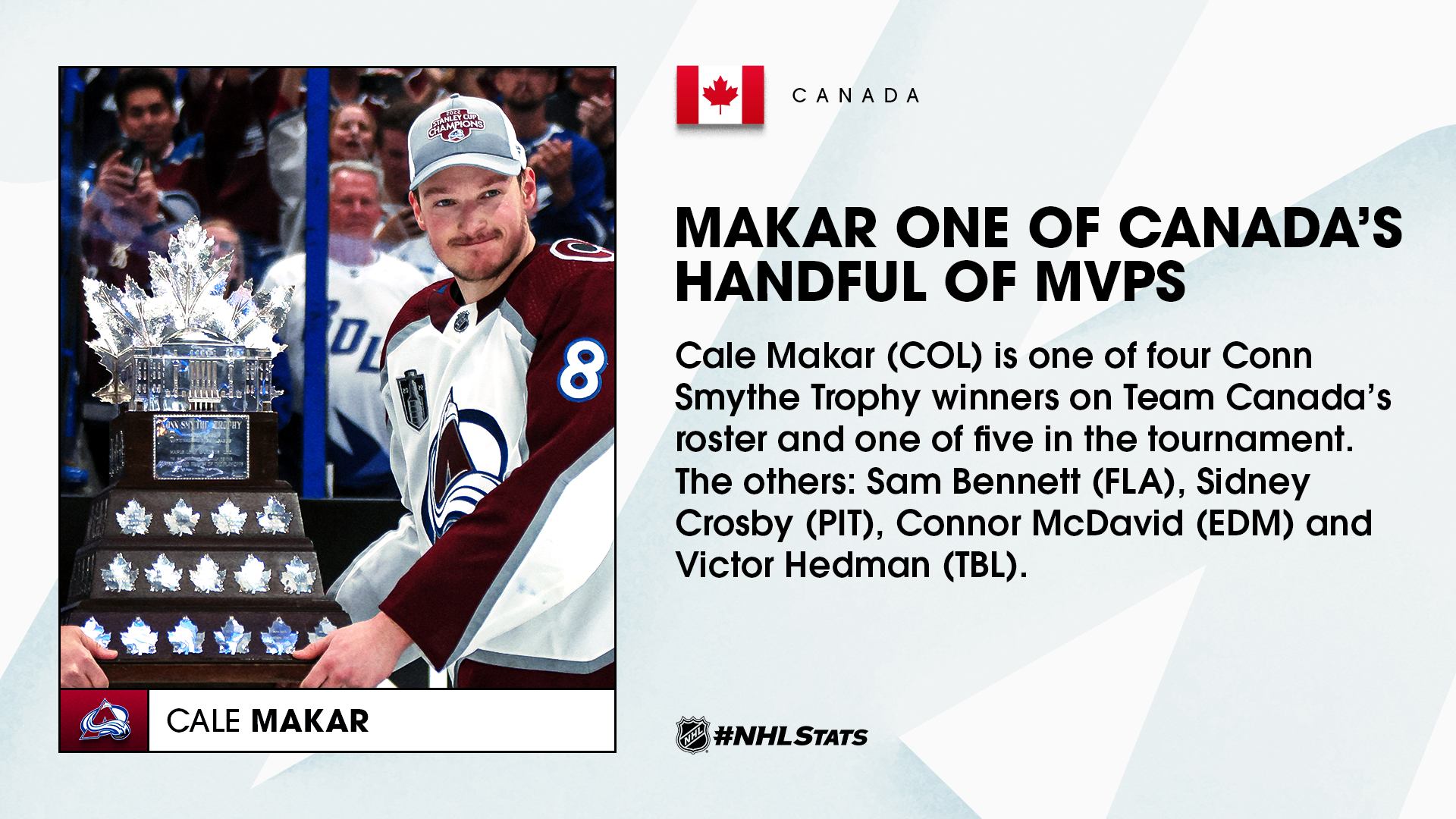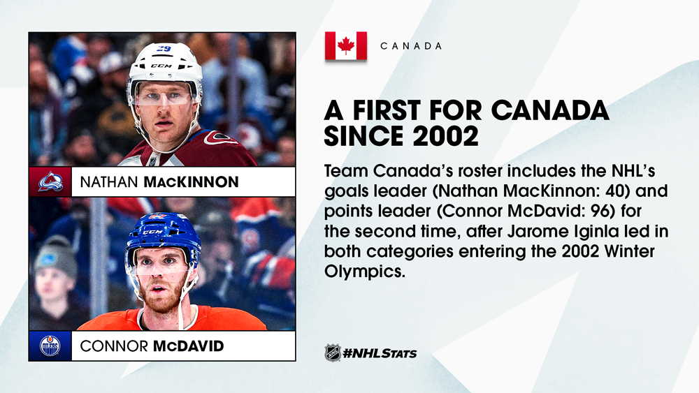 Avalanche forward Nathan MacKinnon and Oilers forward Connor McDavid will aim to accomplish a similar feat to Jarome Iginla, who entered the 2002 Olympic Winter Games leading the NHL in goals (35) and points (64) and went on to help Canada earn the gold medal and finish the season as the Art Ross Trophy and Maurice “Rocket” Richard Trophy winner. McDavid will serve as alternate captain alongside MacKinnon’s Avalanche teammate, defenseman Cale Makar.