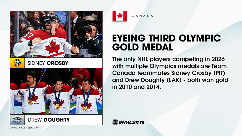 Sidney Crosby and Drew Doughty are set to become the only active NHL players who have competed in three Olympic games and will aim to become the first two to win three gold medals at Olympic Winter Games NHL players have participated. Crosby will be the oldest NHL player competing in Milan and will become the third player age 38-plus to skate for Team Canada at Olympics involving NHL players, following Martin St. Louis in 2014 (38 years, 250 days at oldest) and Al MacInnis in 2002 (38 years, 228 days at oldest).