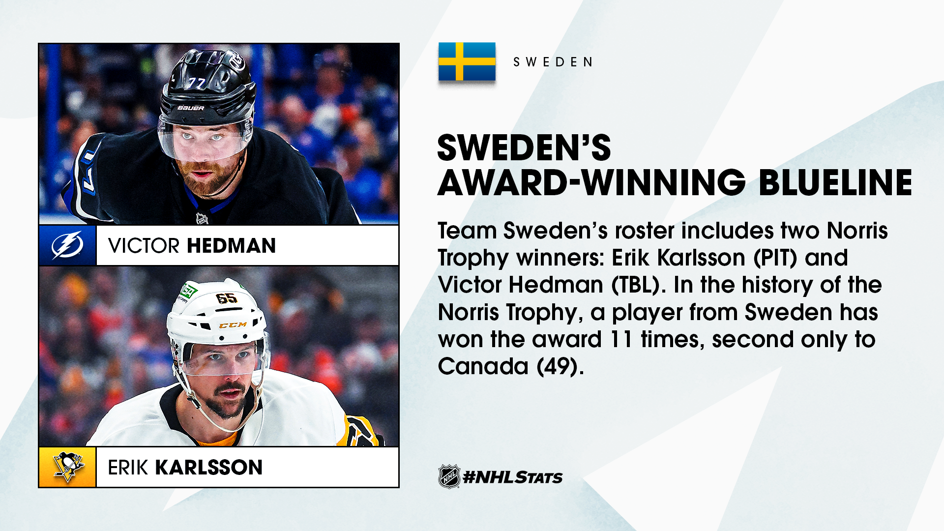 Lightning defenseman Victor Hedman and Penguins defenseman Erik Karlsson look to follow in Lidstrom’s footsteps as the Norris Trophy-winning stars guide Sweden into a head-to-head meeting against longtime-rival Finland during the round-robin. Karlsson (3x) and Lidstrom (7x) are the only European players to win the Norris Trophy multiple times. Hedman and Karlsson will serve as alternate captains this year.