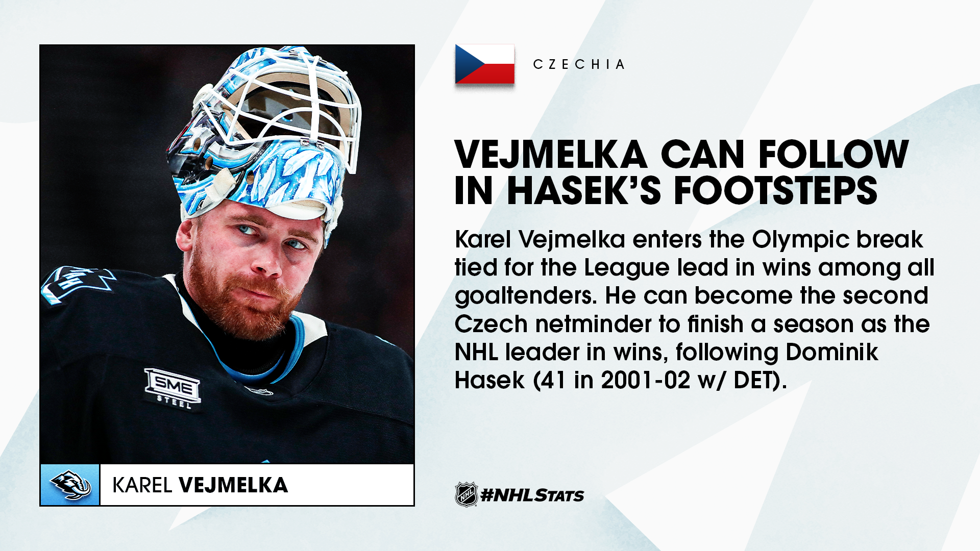 Goaltending will be a focal point for Team Czechia once again at the 2026 Olympic Winter Games as Karel Vejmelka (Utah Mammoth), Lukas Dostal (Anaheim Ducks) and Dan Vladar (Philadelphia Flyers) man the crease. Vejmelka (27-14-2) and Dostal (21-13-2) have combined for 48 total wins – tied for the most by any two goaltenders of the same nationality in 2025-26. Vejmelka is also tied with Andrei Vasilevskiy for the League lead in wins among all netminders and is on pace for 38 victories this season. Only two Czech goaltenders in NHL history have posted as many in a campaign: Roman Turek (42 in 1999-00 w/ STL) and Dominik Hasek (41 in 2001-02 & 38 in 2006-07 w/ DET).