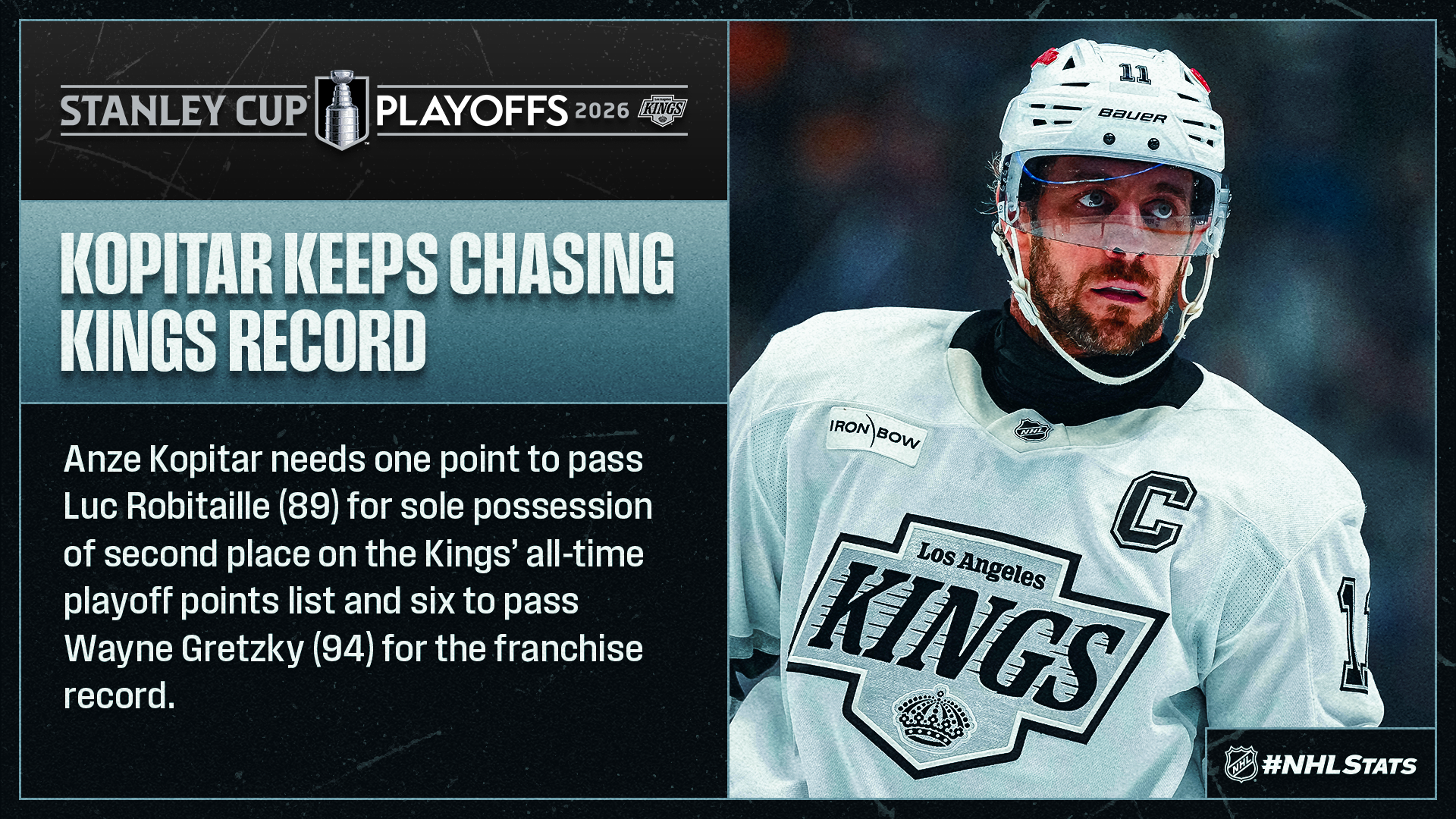 * Anze Kopitar and the Kings look to even their series at one apiece – Los Angeles holds an 8-18 (.308) record when trailing 1-0 in a best-of-seven series, with its most recent such win coming in the First Round of the 2024 Stanley Cup Playoffs versus Edmonton. Kopitar has 27-62—89 in 104 career playoff games and can climb the franchise’s all-time points and assists list.