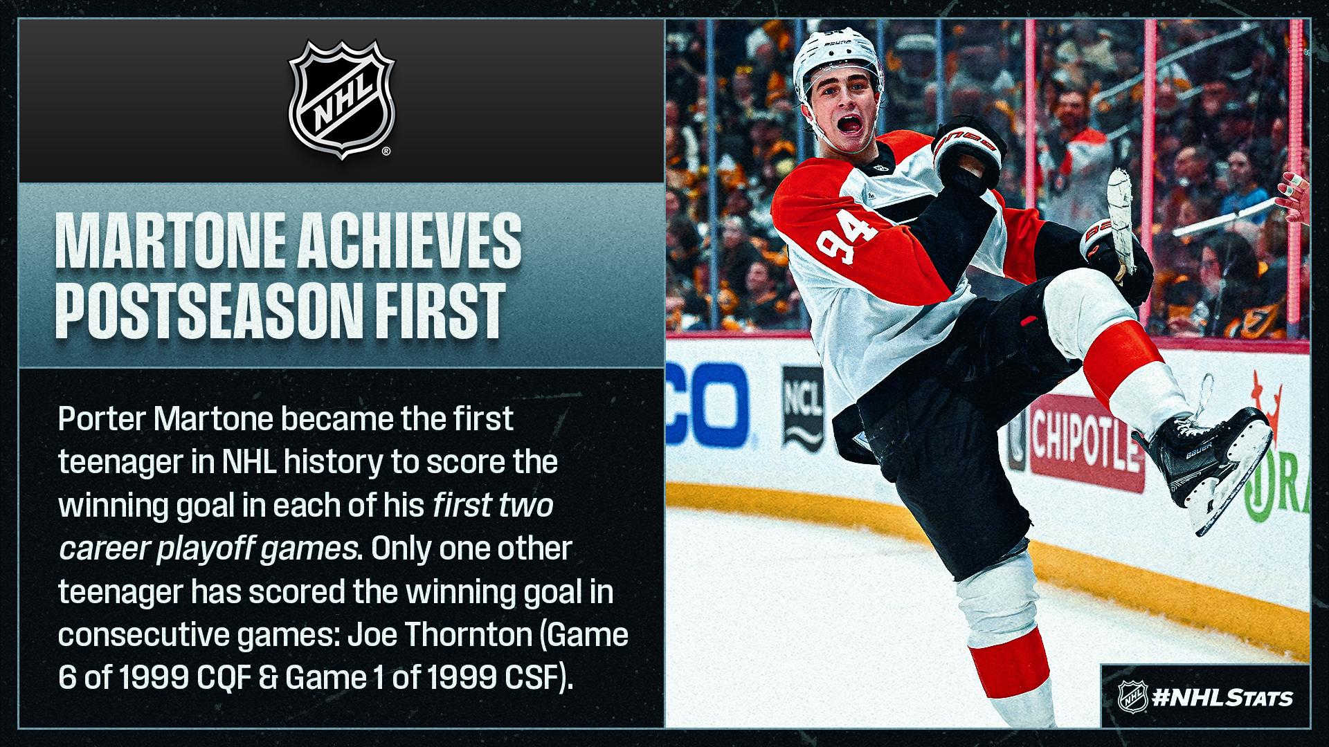 * Porter Martone became the first teenager in NHL history to score the game-winning goal in each of his first two career playoff games as the Flyers took a 2-0 lead in the “Battle of Pennsylvania.”