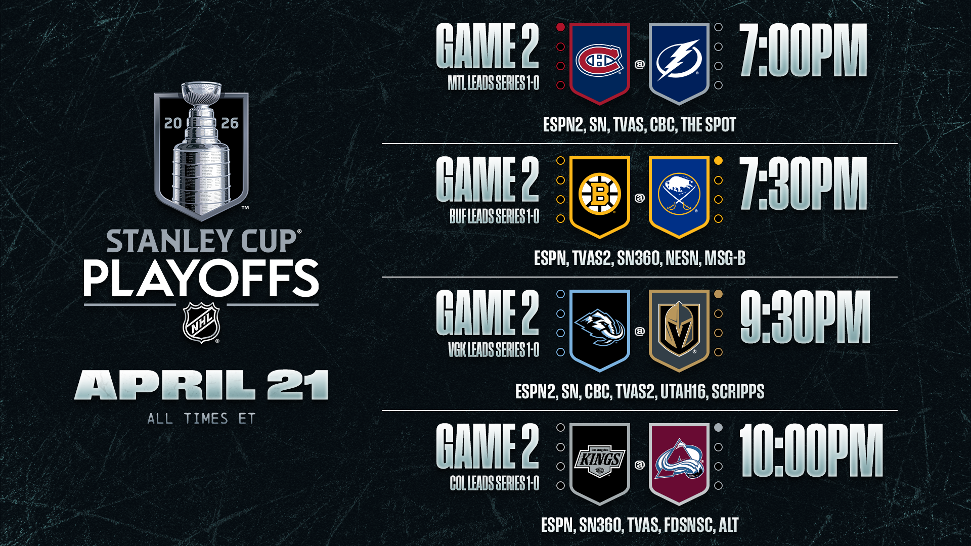 A doubleheader broadcast nationally in Canada on Sportsnet opens with the Lightning aiming to even their series at home against the Canadiens and closes with the Mammoth attempting to secure their first-ever playoff win. The Bruins open a two-pack on ESPN looking to bounce back in Game 2 against the Sabres while the Kings look to return to Los Angeles with a series stalemate. Click here to read the April 21 edition of #NHLStats: Live Updates, which has notes ahead of each contest.