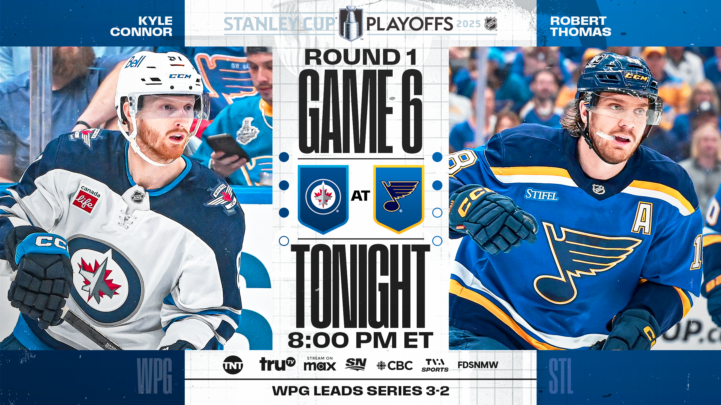 The Stanley Cup Playoffs spotlight shifts to Enterprise Center for another Game 6 as the Blues and Jets battle on TNT, Max, Sportsnet and TVA Sports in Friday’s lone game. St. Louis will look to continue the trend of the home team being undefeated this series and force the second Game 7 of the opening round, while Winnipeg eyes its first series victory since 2021.
