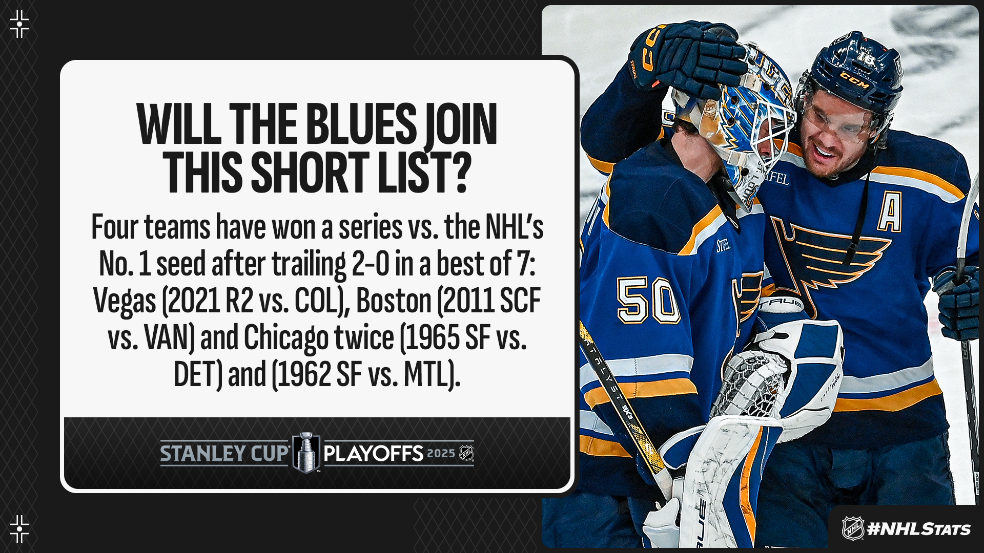 * The Blues–Jets series shifts back to Winnipeg for Game 5 after the home team has won each of the first four. St. Louis is the second team in four years to rally from a 2-0 series deficit against the Presidents’ Trophy winner to even the series – Vegas was the last to do so in the 2021 Second Round in an eventual six-game series win over Colorado.