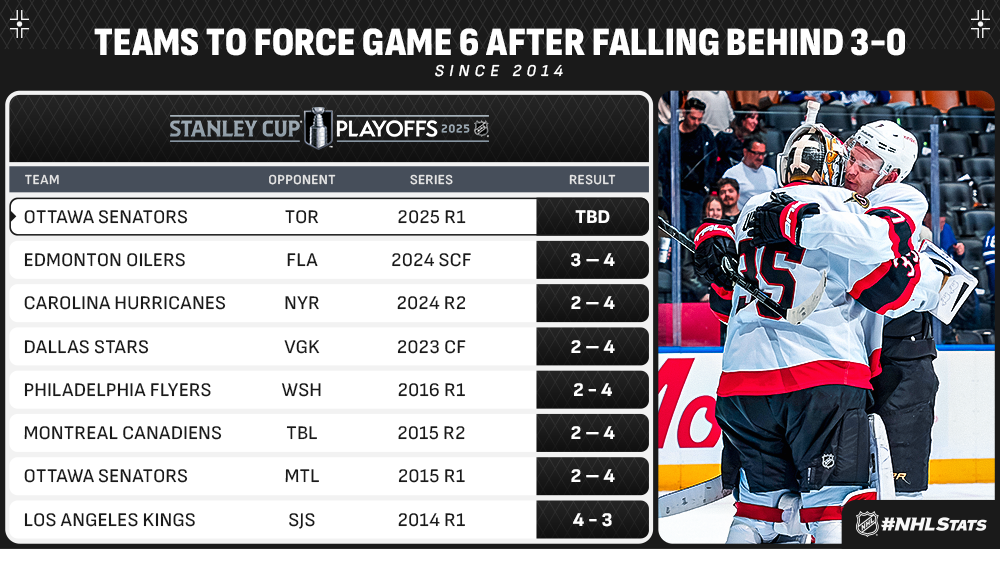 Three days after he told the home crowd at Canadian Tire Centre “We’ll be back” following his club’s Game 4 victory, Senators captain Brad Tkachuk (1-2—3) posted three points and complemented Linus Ullmark’s 29-save shutout. Ottawa accounts for two of eight instances of a team forcing a Game 6 after falling behind in a series 3-0 under the current playoff format.