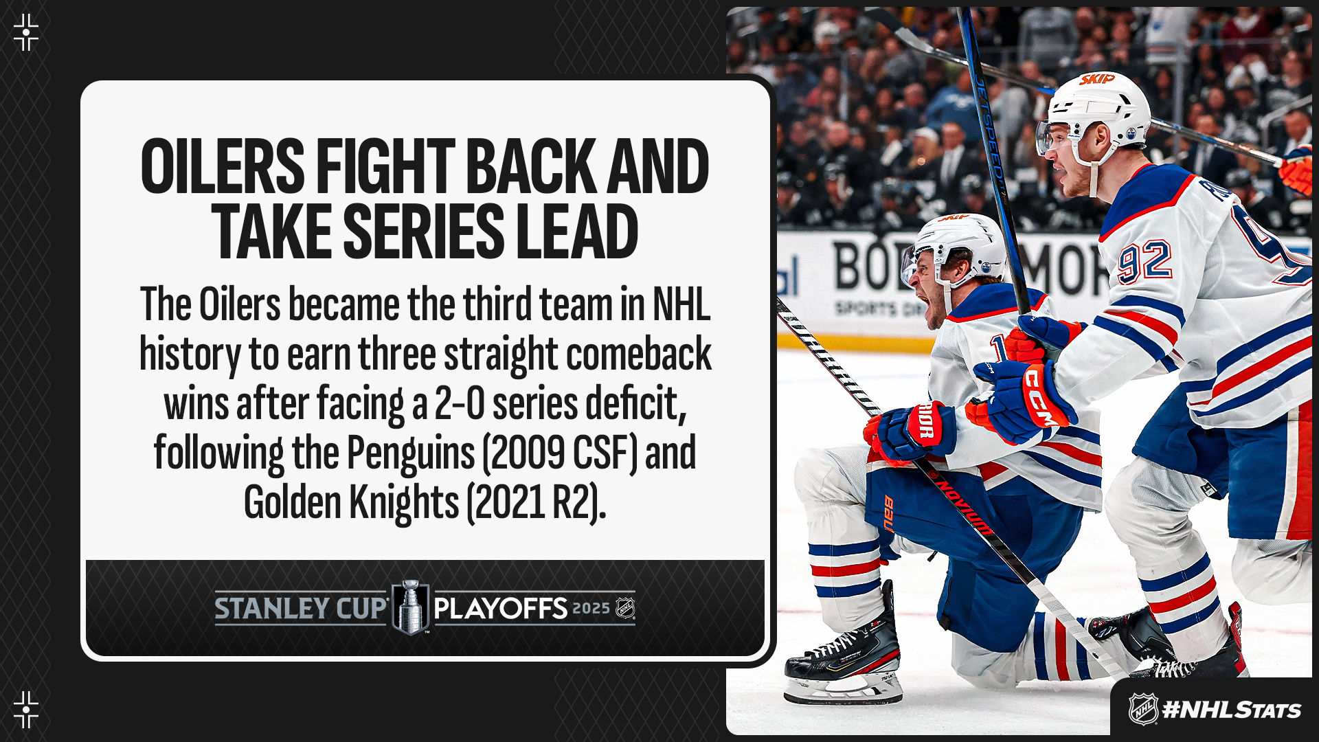 * After surrendering the first goal of the game, Edmonton’s Evander Kane, Mattias Janmark and Ryan Nugent-Hopkins each found the back of the net to guide the Oilers to a 3-1 win and a 3-2 series advantage – their first lead of the First Round. Edmonton won three straight comeback games in a postseason for the first time in franchise history and became the first team to achieve the feat since Vegas in 2023 (4 GP).