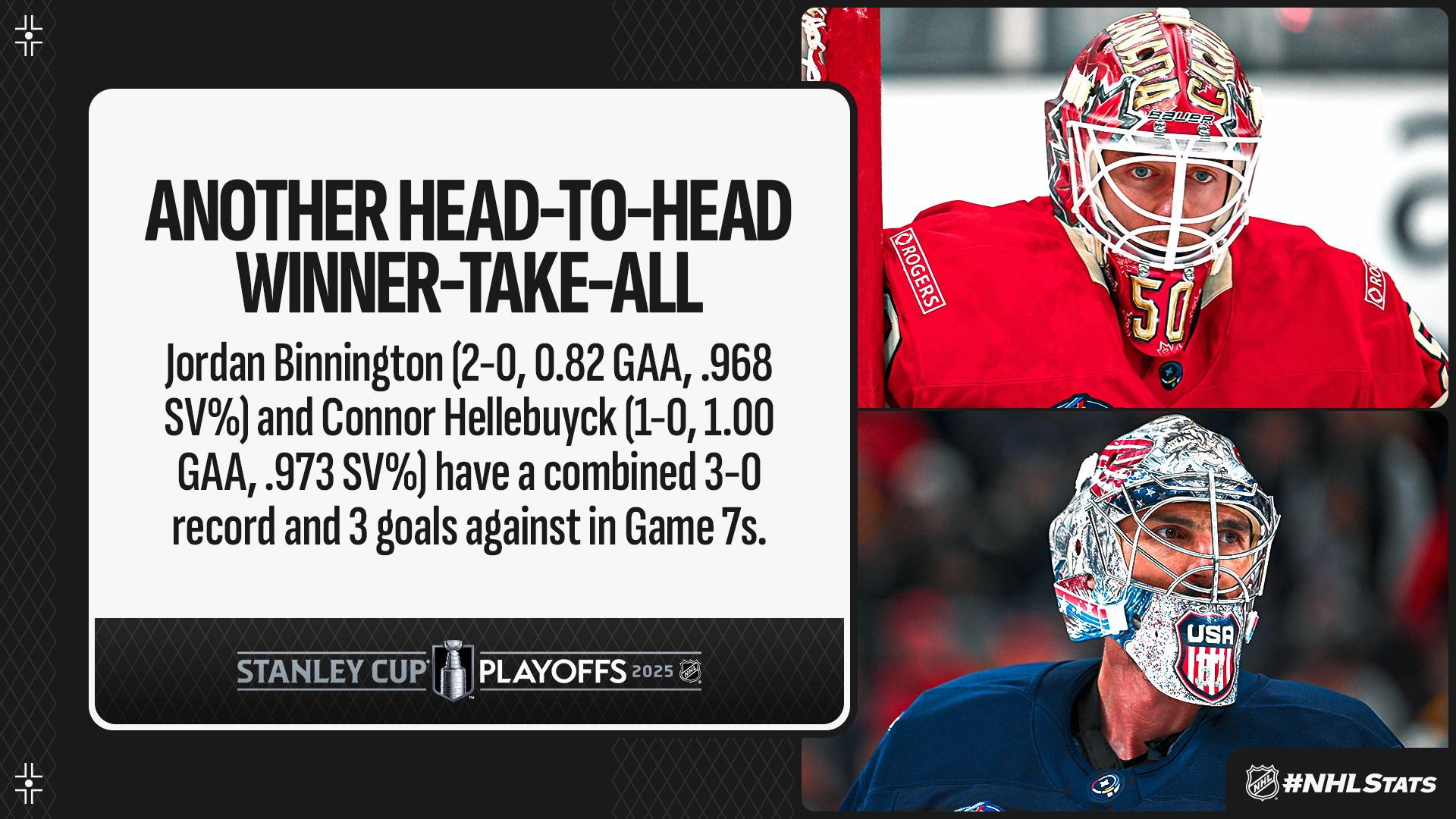 Jordan Binnington and Connor Hellebuyck will go head-to-head in a winner-take-all game for the second time in two and a half months, following Binnington’s 31-save overtime victory against Hellebuyck (24 saves) in Canada’s 3-2 overtime victory against USA in the 4 Nations Face-Off championship game. Both goaltenders are perfect in winner-take-all games during the Stanley Cup Playoffs and neither has allowed more than one goal against in a Game 7.