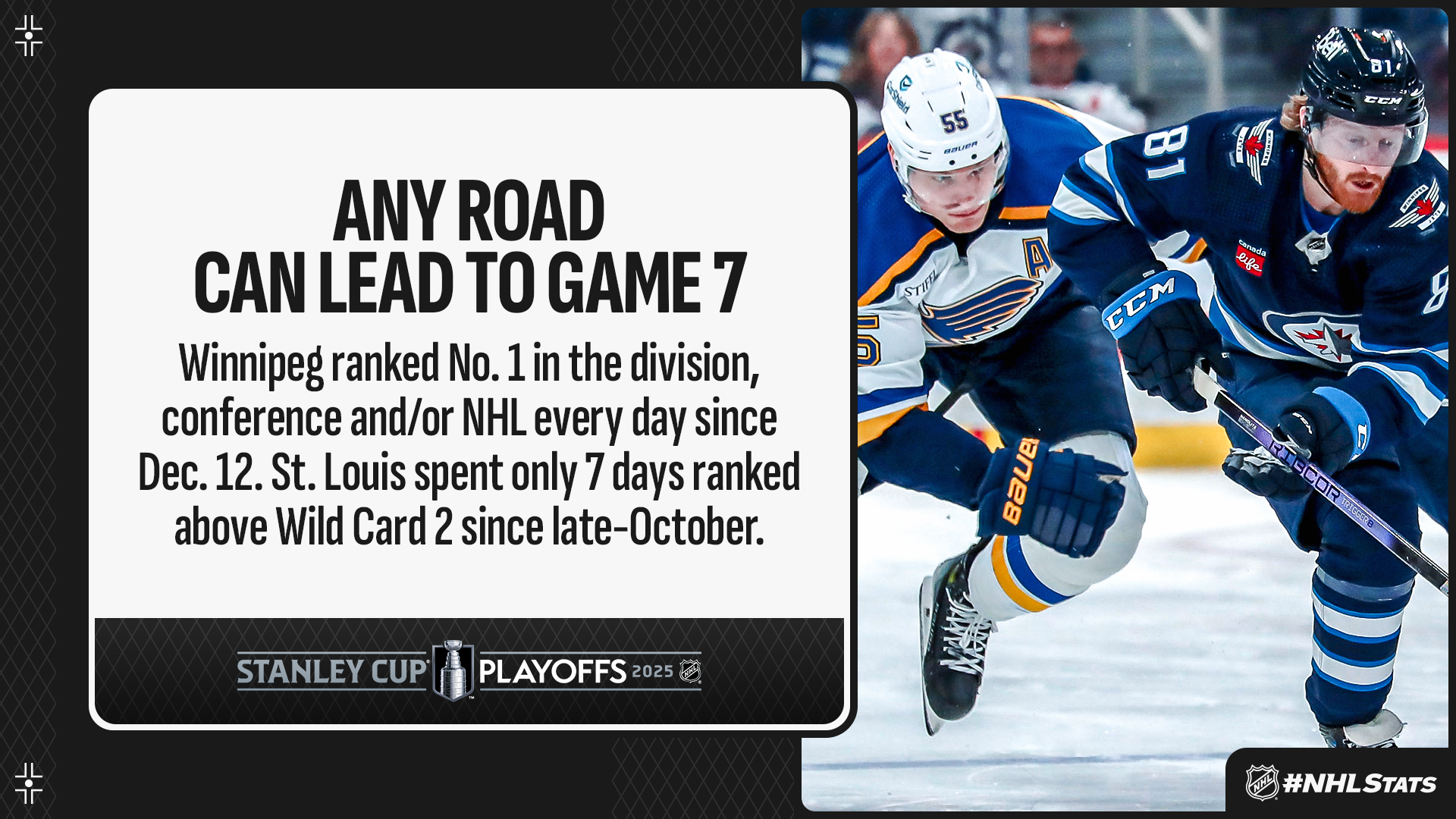 * While this matchup is both the 13th Game 7 involving a Wild Card team and 26th involving the Presidents’ Trophy winners, it also is a battle between two “No. 1 teams”: Winnipeg topped the overall NHL standings for much of the season and finished with that rank, while St. Louis put themselves in this position by posting the League’s top record from the 4 Nations Face-Off onward.
