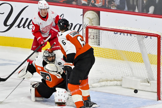 NHL 2026_04_02 Philadelphia Flyers vs Detroit Red Wings Published April 3, 2026 at 535 × 356 in Red Wings double up Flyers, 4-2 A shot by Alex DeBrincat #93 of the Detroit Red Wings get past Philadelphia Flyers goalie Samuel Ersson #33