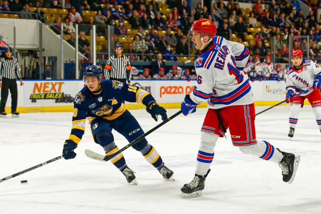 An early power-play for the Rangers in the third period created the opportunity for Carson Rehkopf to complete the hattrick. On a pass down to Joseph Serpa below the goal line, followed by right back to Rehkopf who one-timed a shot through the five-hole of Kyle Downey. Erie scored two consolation goals late to make it an 8-4 game. Elias Cohen and Kaleb Smith scoring the goals respectively.