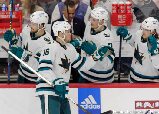 Steven Lorentz #16 of the San Jose Sharks is congratulated by his teammate for his goal in the second period against the Philadelphia Flyers.