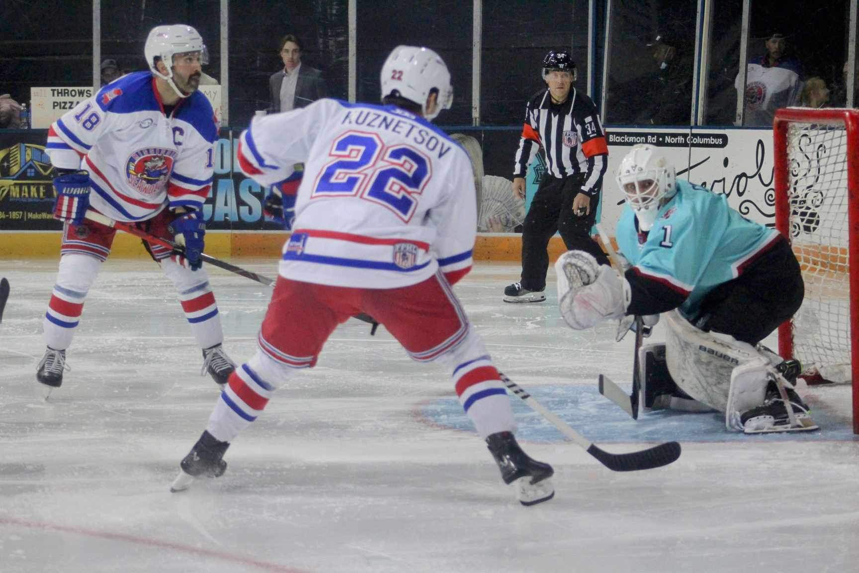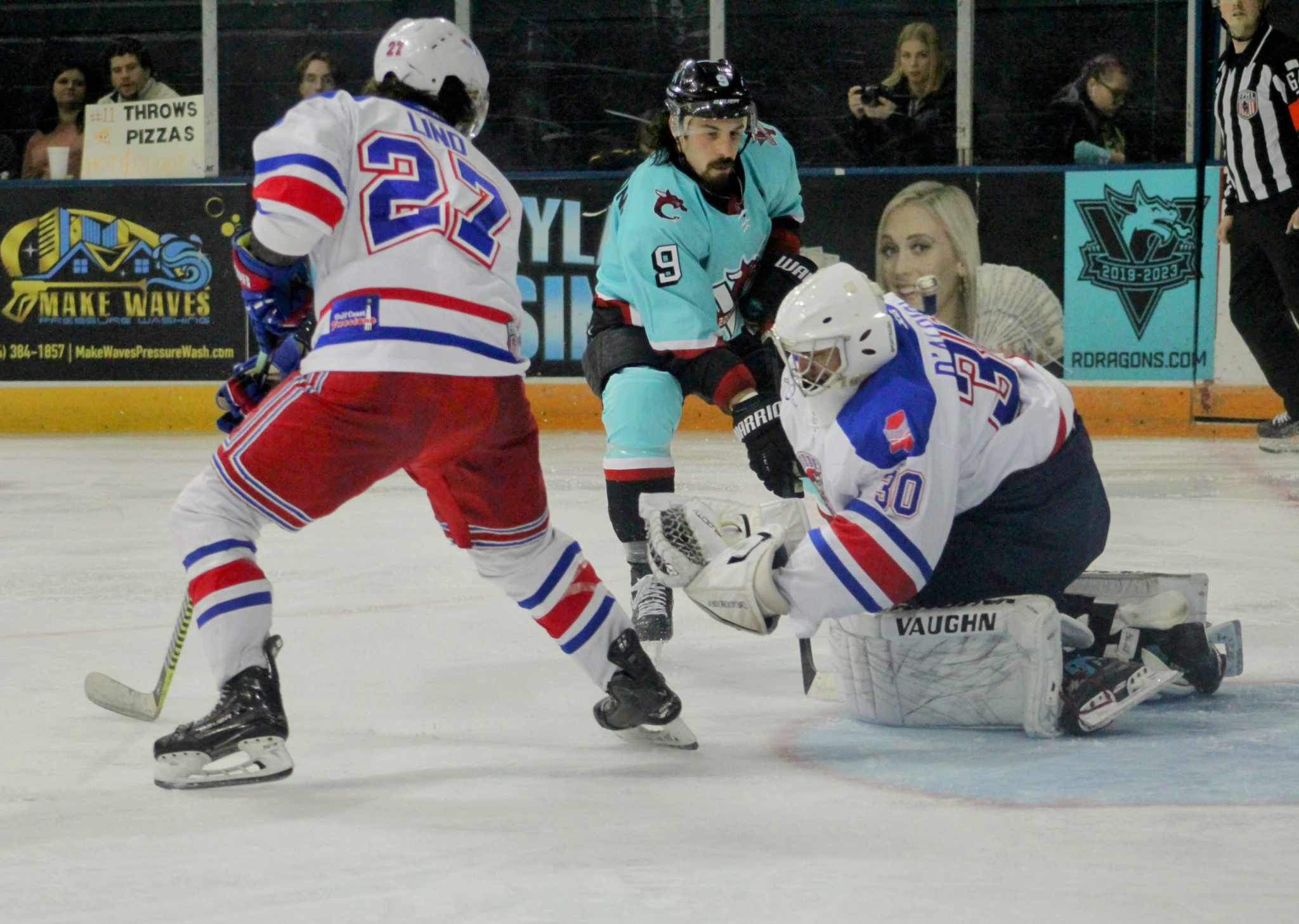 Breandan Colgan made 18 saves tonight for the River Dragons, compared to the Sea Wolves’ Blake Weyrick, who had to step up to 50 shots on goal and saved 44 of them.