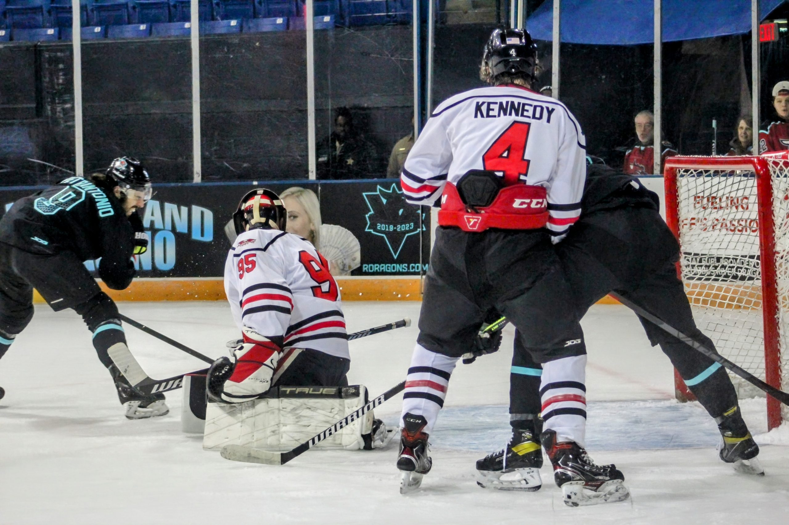 Not long after, at 8:16, Justin MacDonald lined up perfectly to add to the River Dragons’ lead, but the goal was knocked off its post by Cody Karpinski leading the refs to rule “no goal”, much to the dismay of MacDonald and his line-mates.