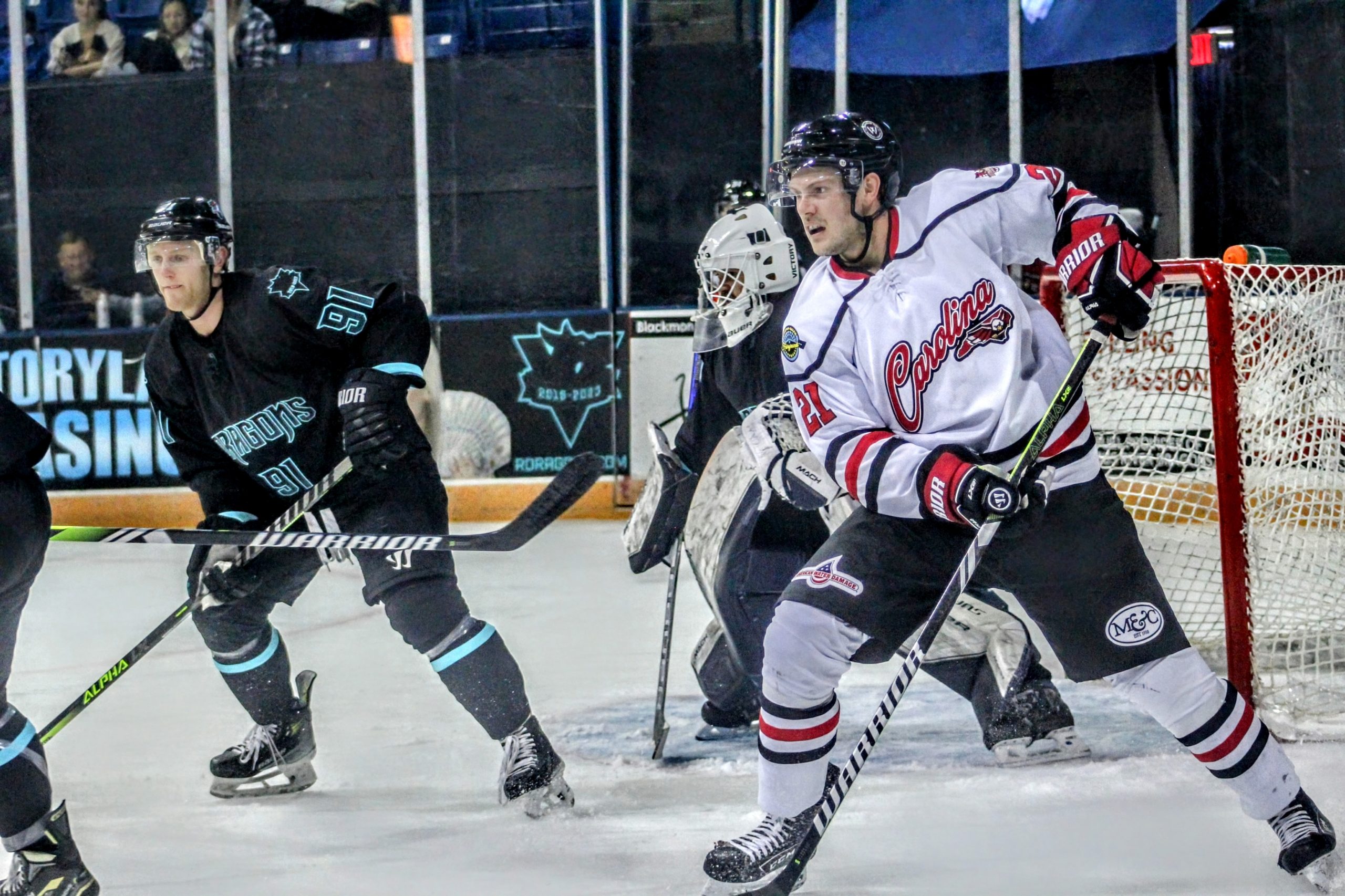 At 9:51, Carolina pressed hard to the River Dragons’ net and appeared to have scored, but the goal was waived off due to the goal being knocked off its posts.