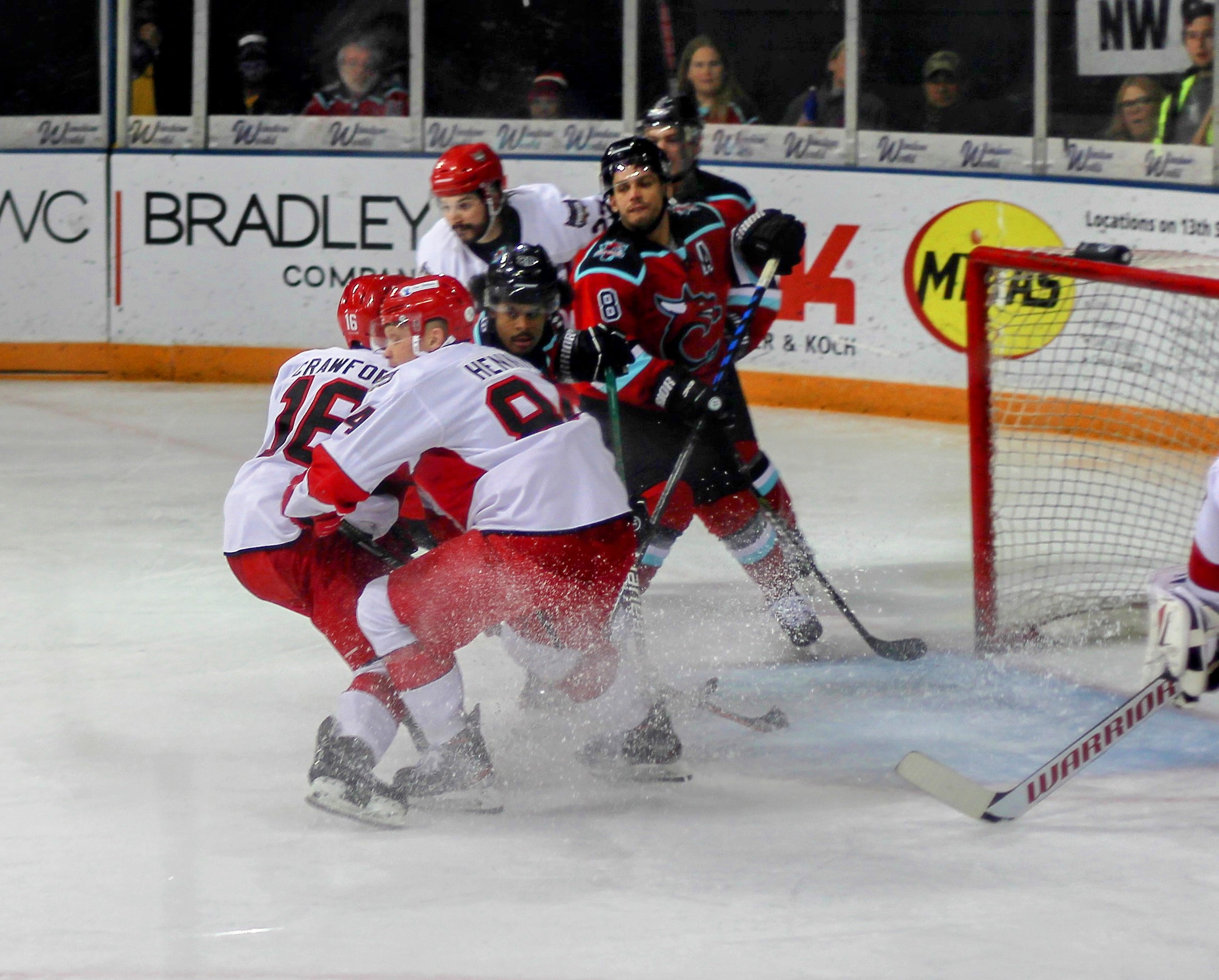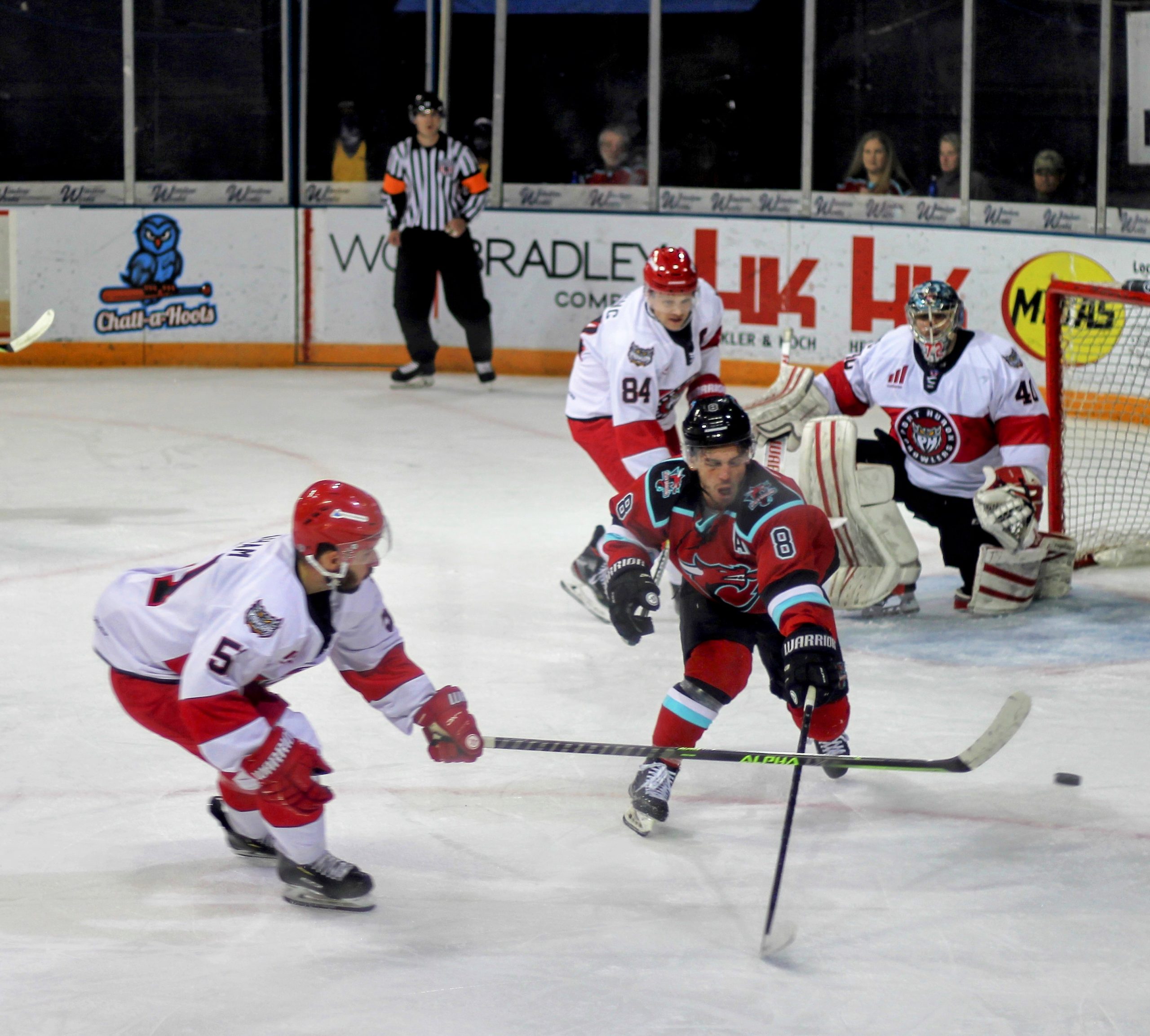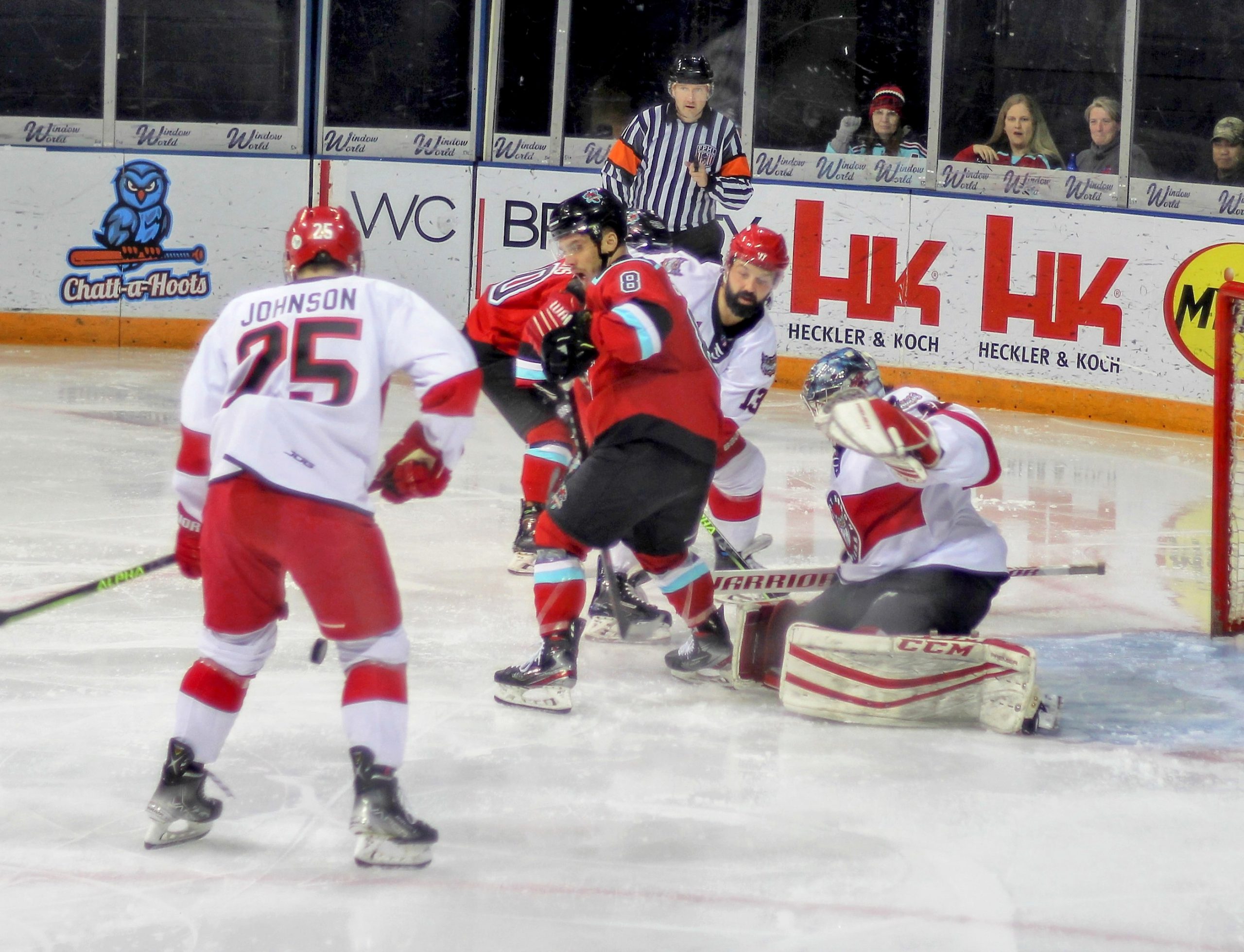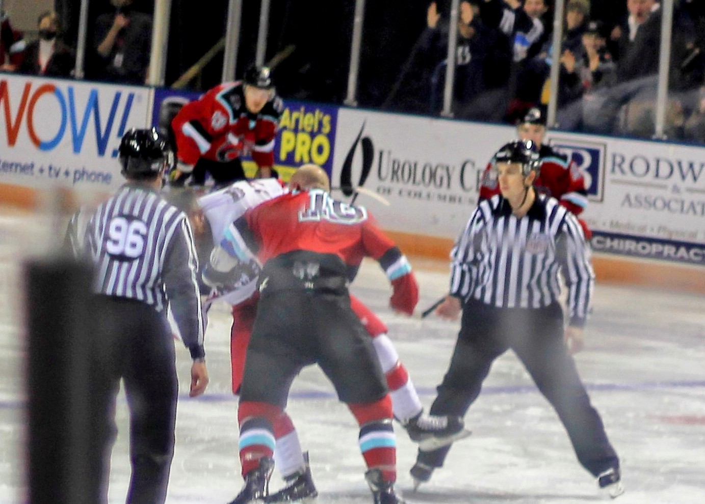 A minute or so after the Jay goal, Port Huron and Columbus had an undercard/main event fight combo with two straight faceoffs resulting in tilts. First Levi Armstrong and Brennan Young scrapped with Armstrong connecting a few of the only punches thrown before they both tumbled to the ice. Then the big boys got into the mix with Nick Williams and Justin Schmit trading heavy shots that seemed to stun both at different times before Schmit toppled Williams to end the fight.