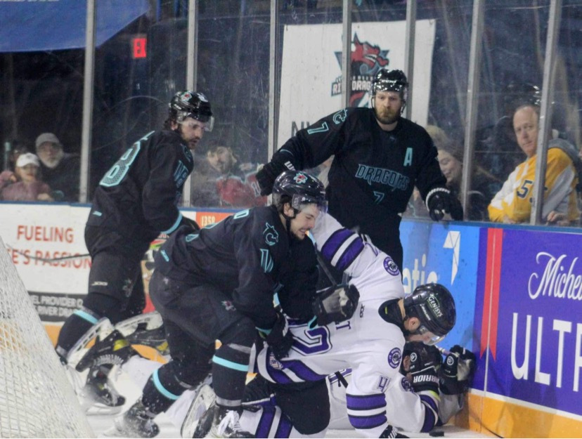 The River Dragons struck first, using fast puck movement and good positioning to overtake the Motor City defense. At 1:45, Austin Daae found the back of the net to kick of what would turn into a high-scoring game.