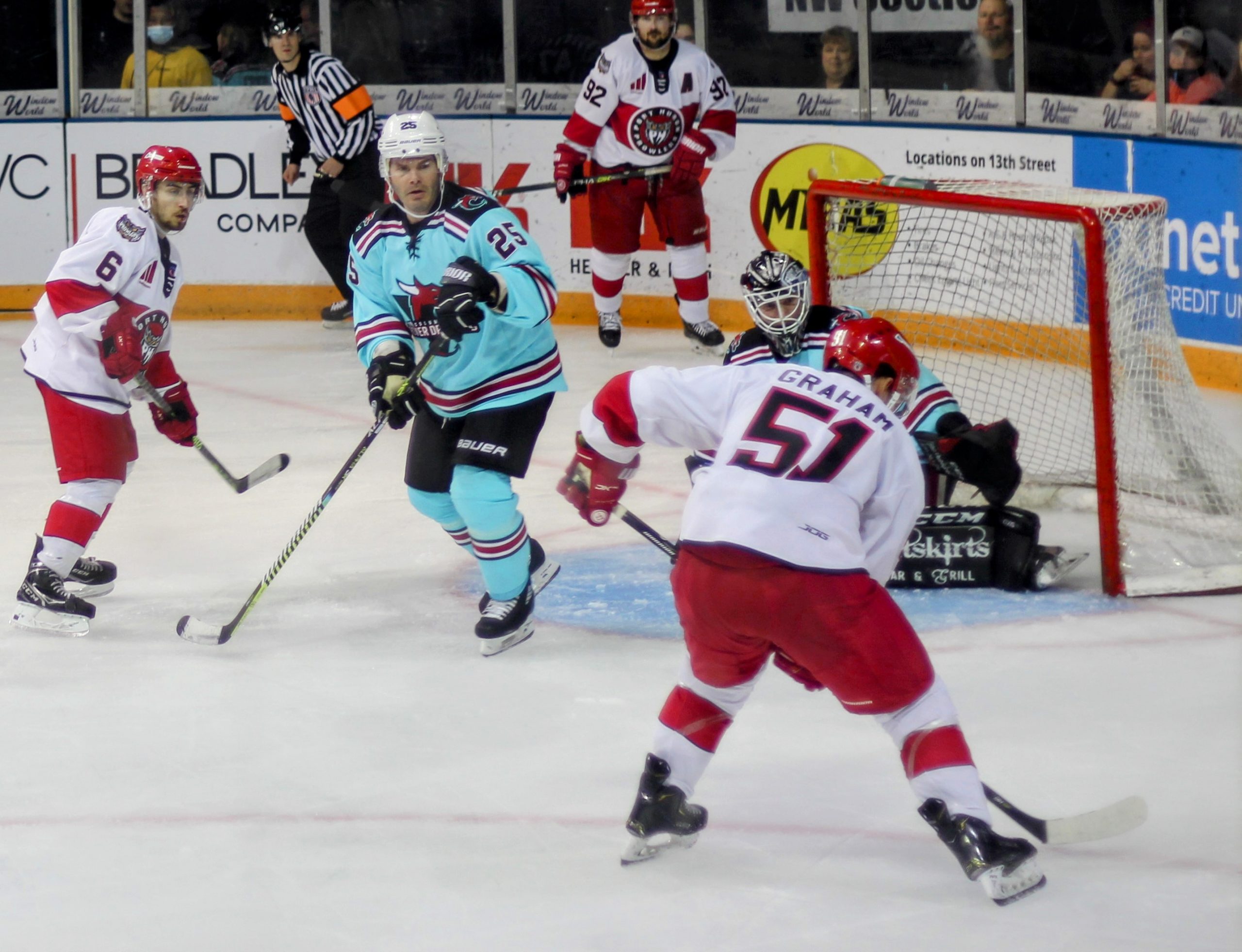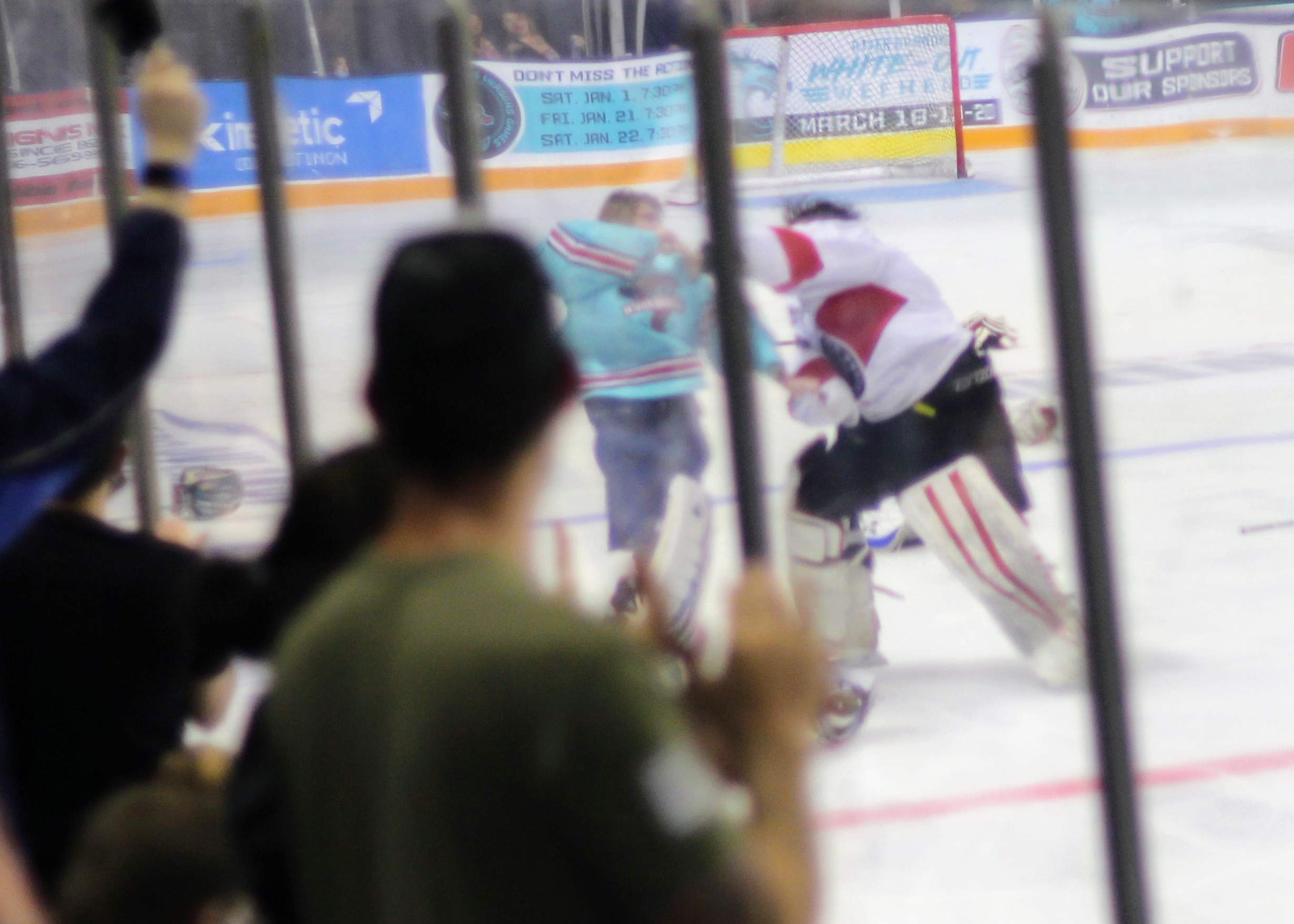 In between the two Dalton Anderson goals there was a dustup that resulted in five ejections and multiple fights including the starting netminders trading punches. After a delayed penalty against Quentin Roseboom for cross checking, Paul Fregeau and Jay Croop took exception and took penalties themselves to turn it in to a 5-on-3 for Port Huron, and those were just the minor penalties. Fregeau then dropped the gloves with Justin Barr and about 20 seconds in to their fight, the crowds eyes shifted to Bailey MacBurnie and Richard Shipman (who had come in relief in the first period for Greg Harney) who began circling and looking to scrap. A quick fight and knockdown saw both goalies escorted off the ice, but we still weren’t done with the fights, as Justin Schmit and Joe Pace ended their nights with a fight after original altercation game misconducts being thrown their way when they dropped the gloves one more time in the series.