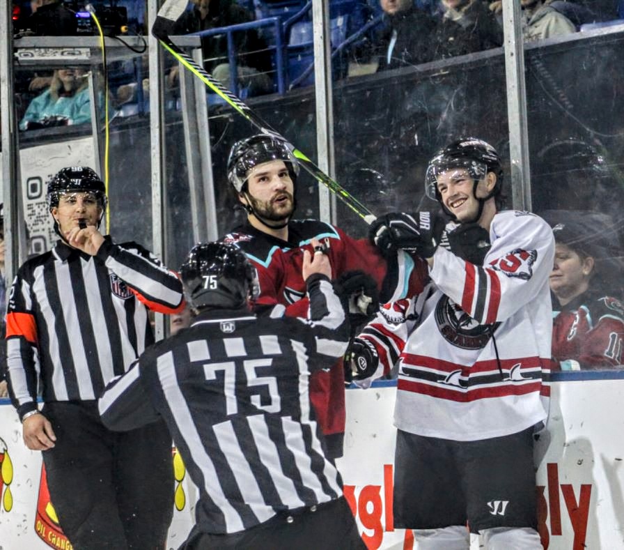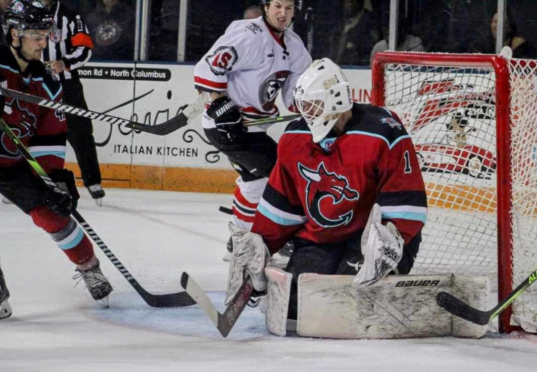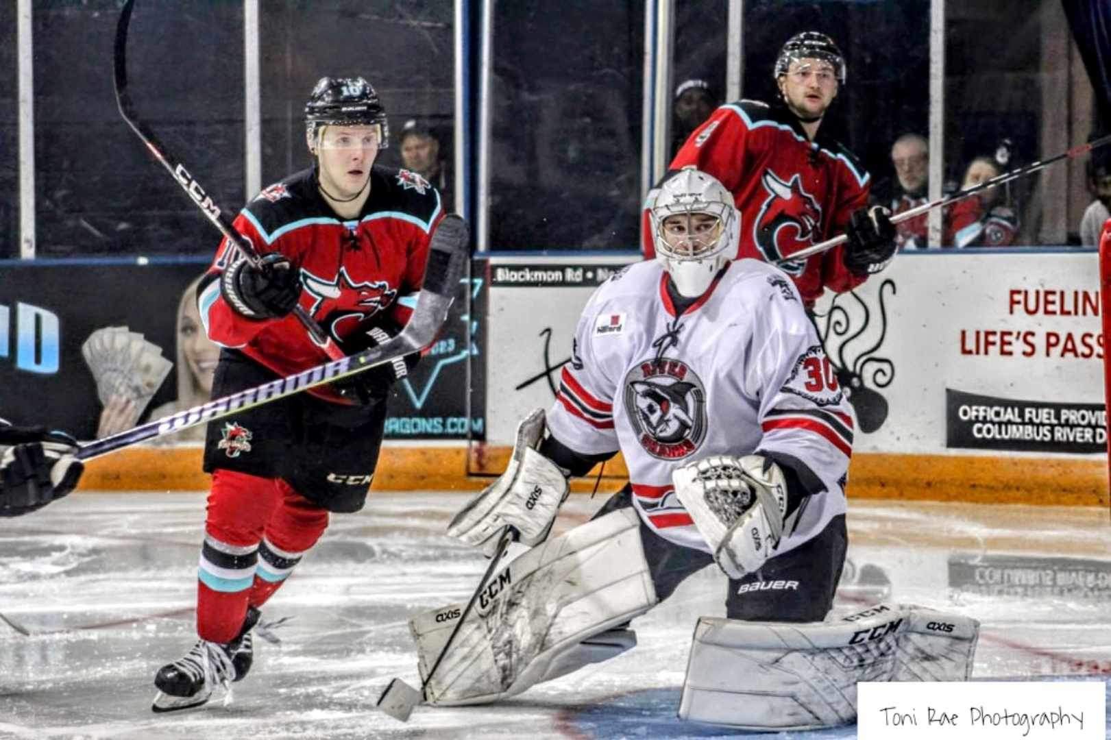 Columbus, GA – Fans came ready for a great night of hockey in the Chattahoochee Valley. The El Mira River Sharks, although new to the FPHL, showed they came to play against the Columbus River Dragons, currently #1 in the Continental League of the FPHL. In the first 30 seconds of the game, Eli Bowers, goalie for the El Mira River Sharks, stood his ground to prevent a breakaway goal by Kyle Moore.