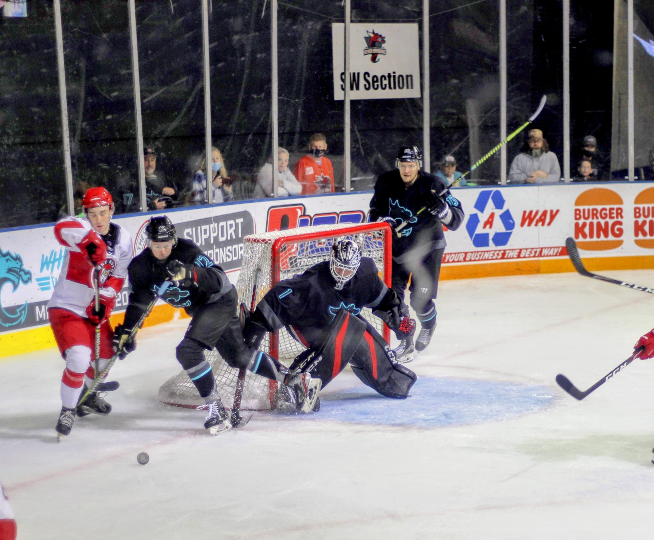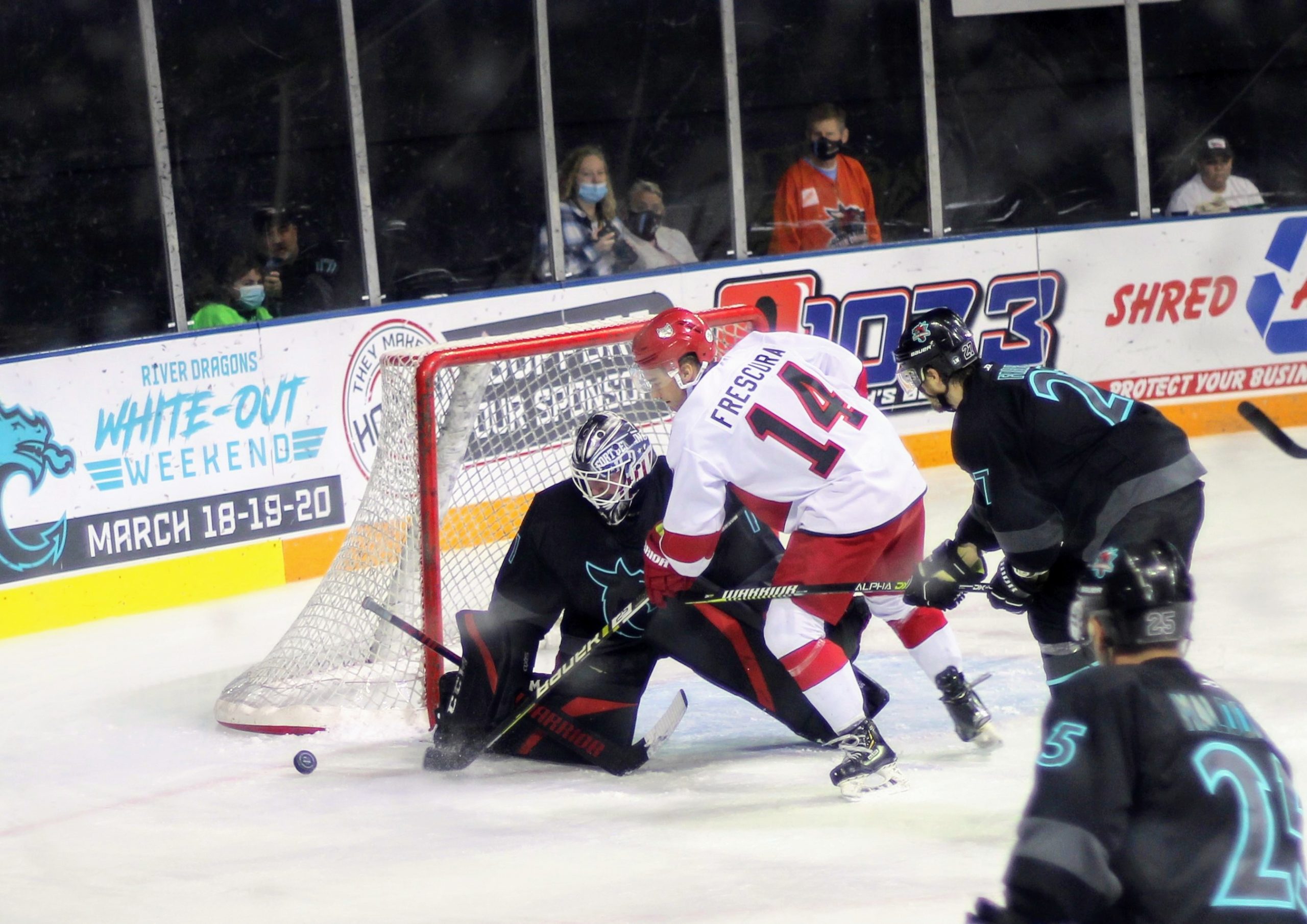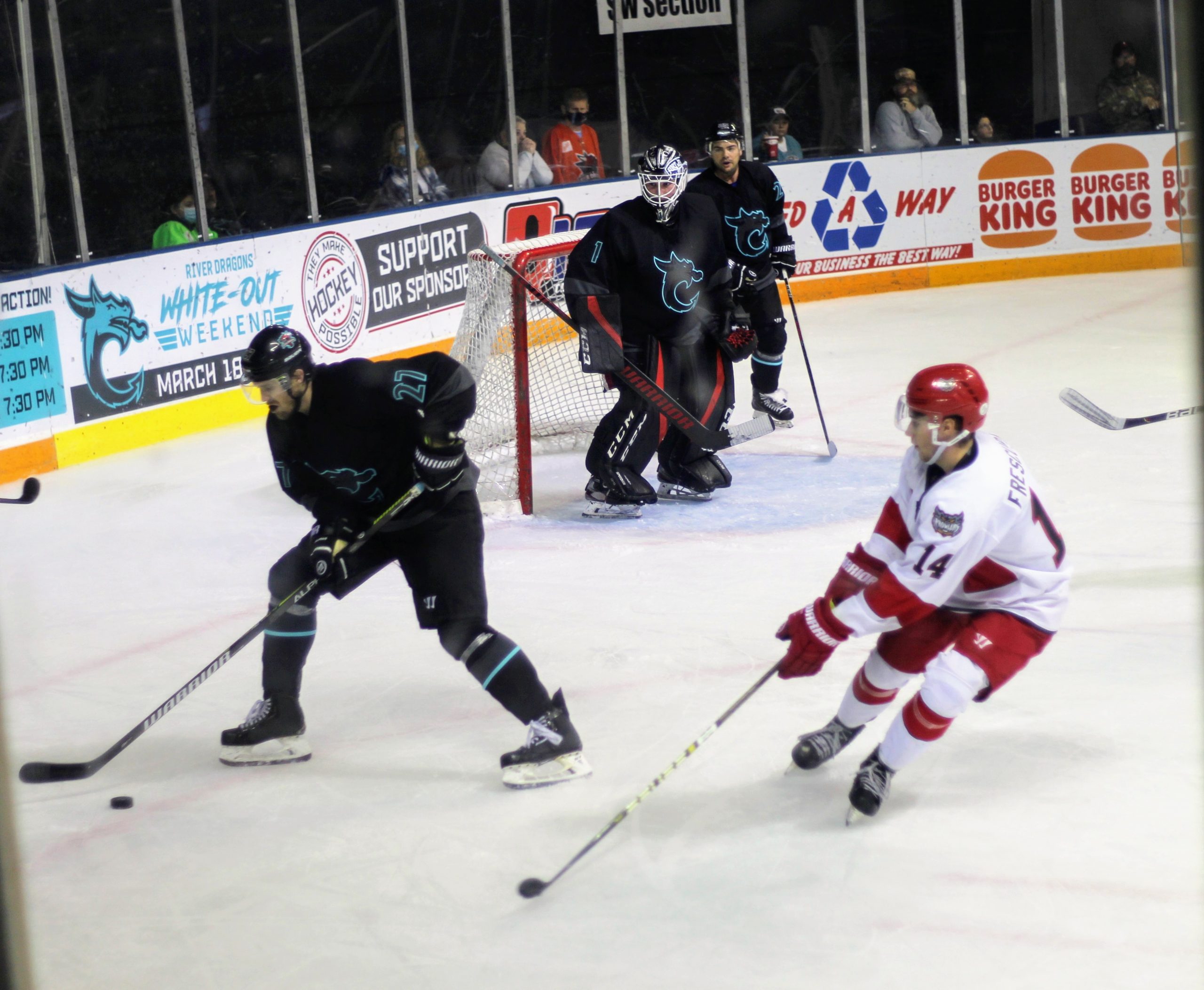 Chaos in front of the goal allowed for Levi Armstrong to slip one past Joe Noonan on a put back at the 9:11 mark to put the River Dragons up 4-1.