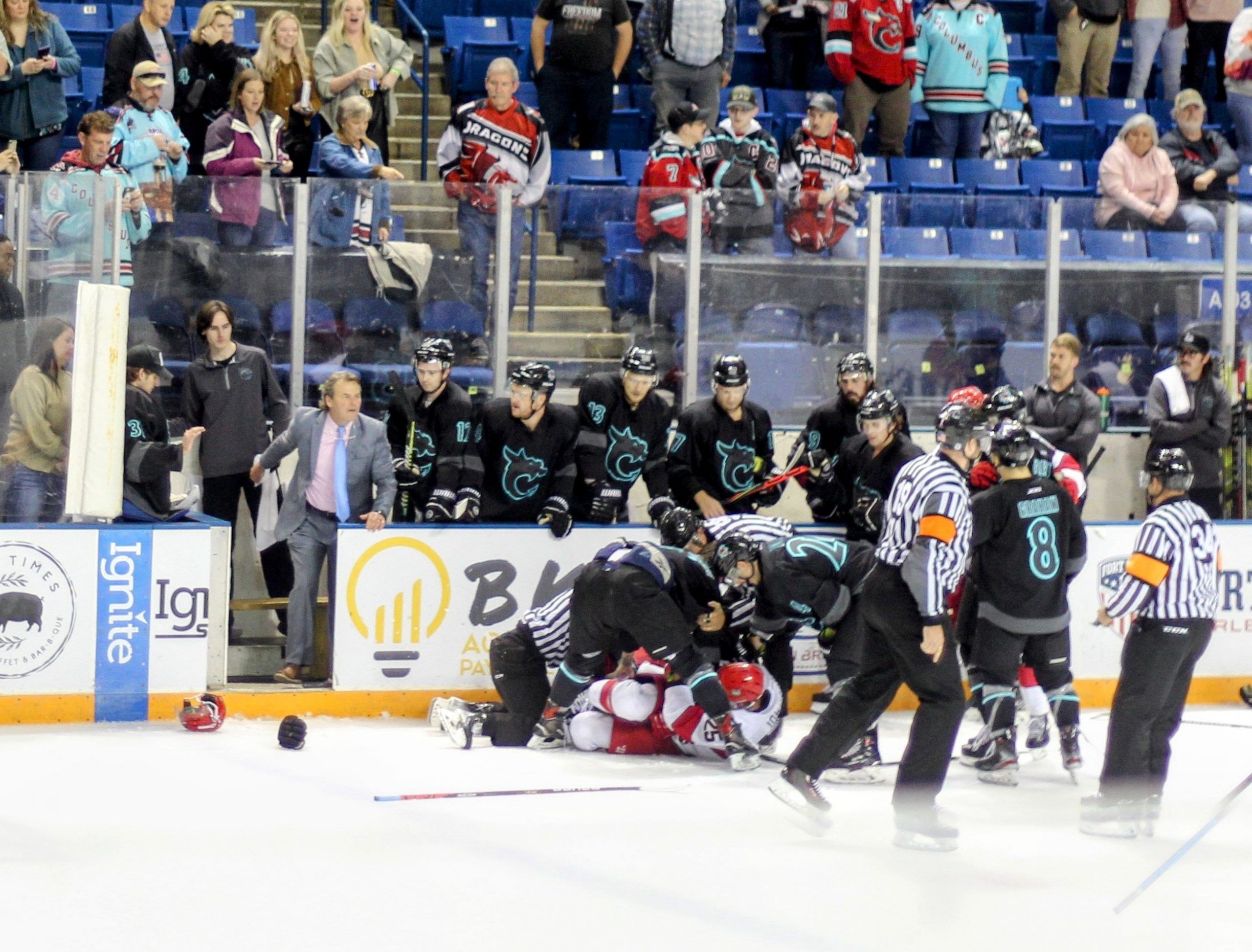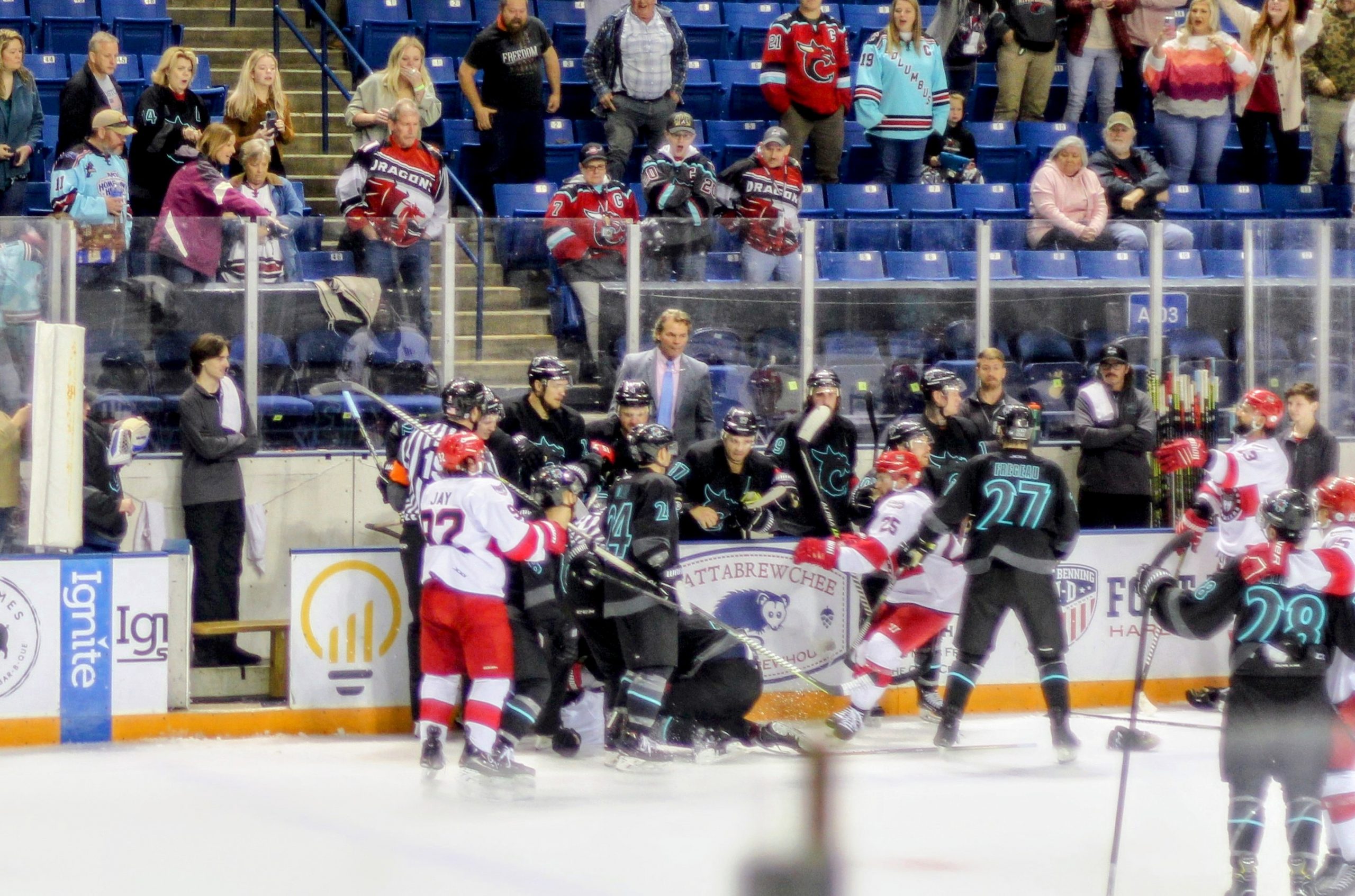 A brawl broke out in front of the River Dragons bench with less than a minute left in the period that saw several players from both teams as well as head coach for the Dragons, Jerome Bechard, ejected.