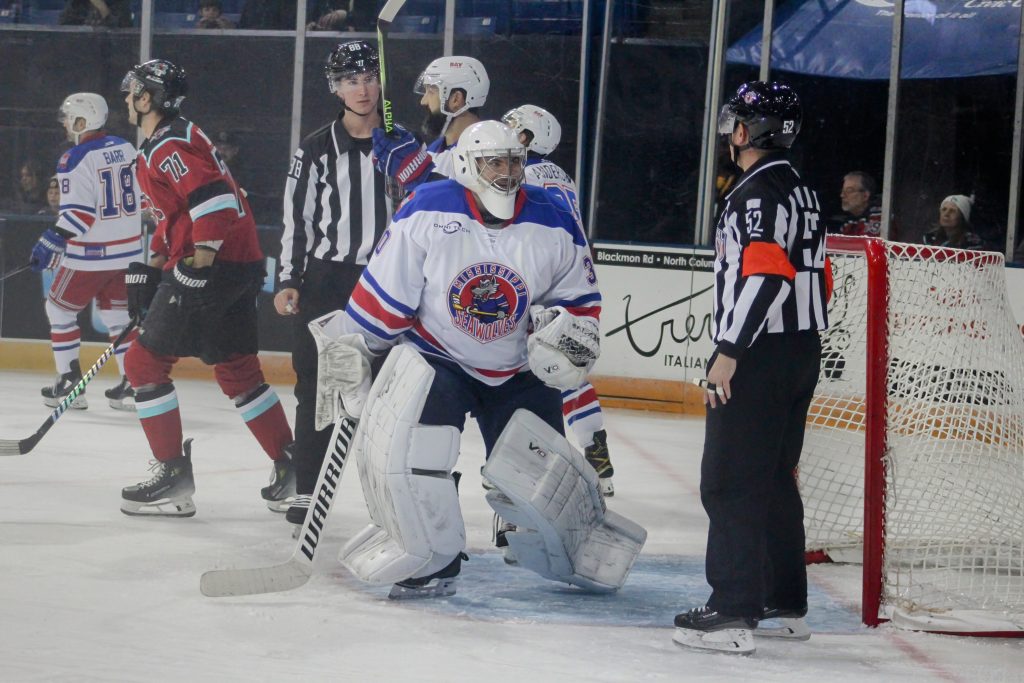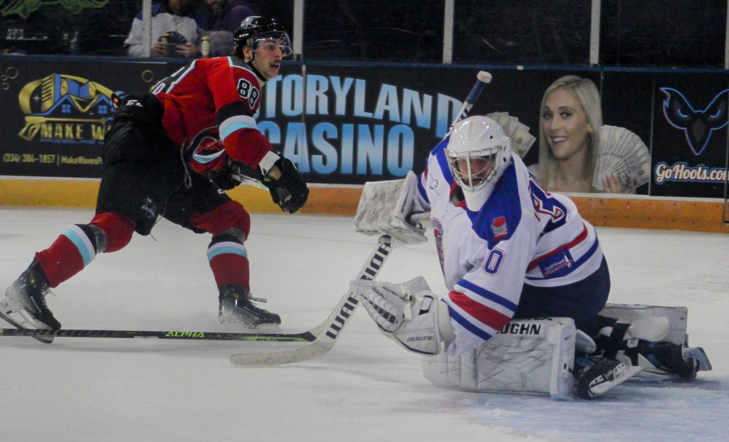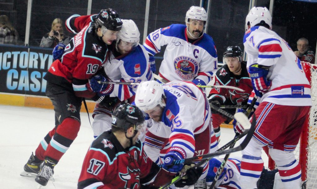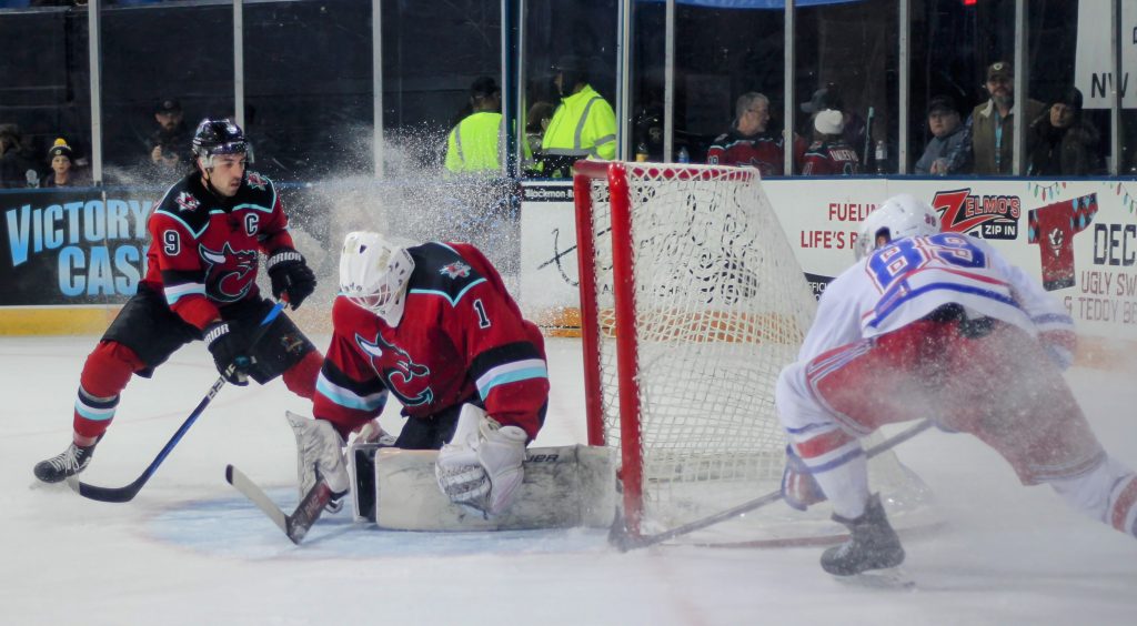 Justin MacDonald scored twice in the first period to get the River Dragons rolling, but the Sea Wolves fought back in the second and after 40 minutes the game was tied at 3-3.