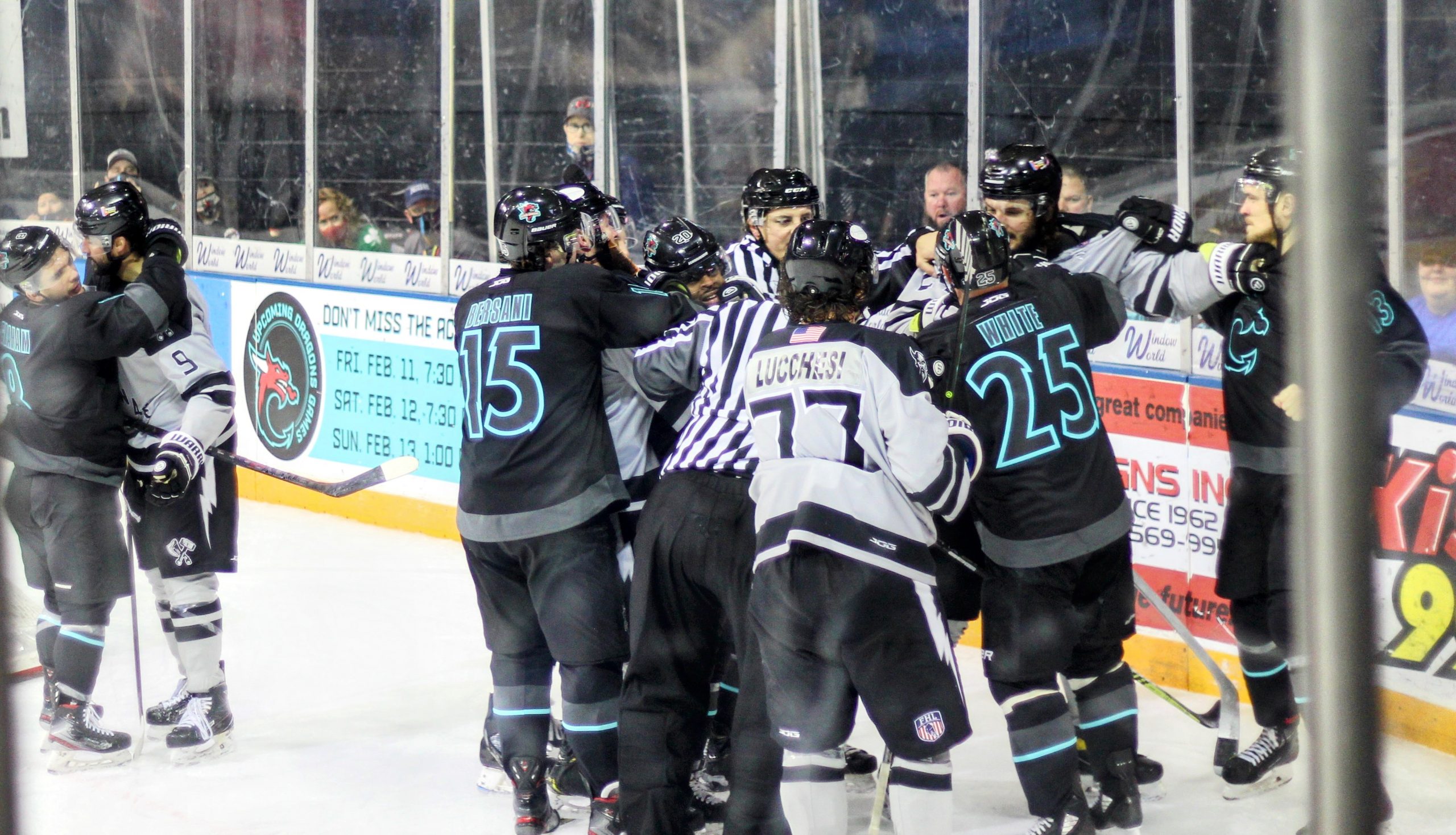 1 second after the empty netter a fight broke out between Brandon Tootoosis and Justin Schmit, much to the delight of the Columbus crowd.