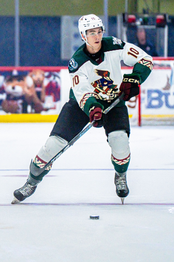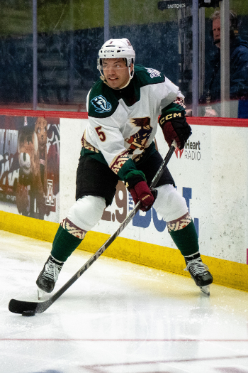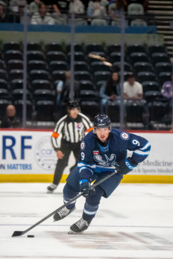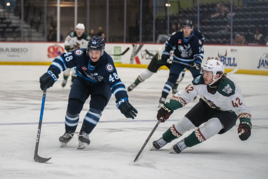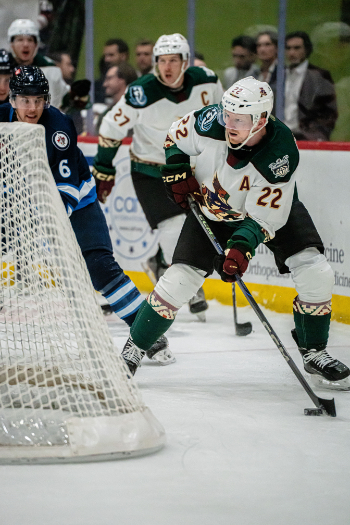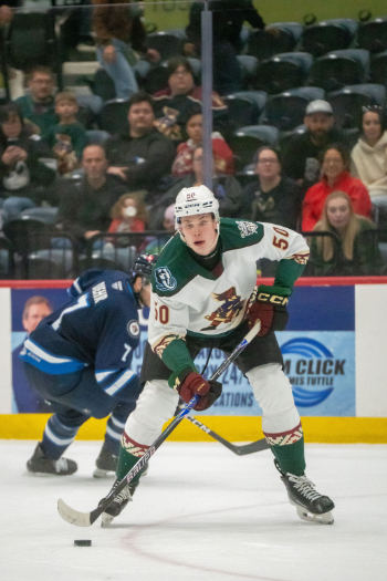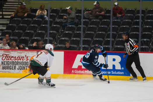 Cameron Hebig carries puck into Tucson zone passed Manitoba defender Ville Heinola – Photo by Max Williamson