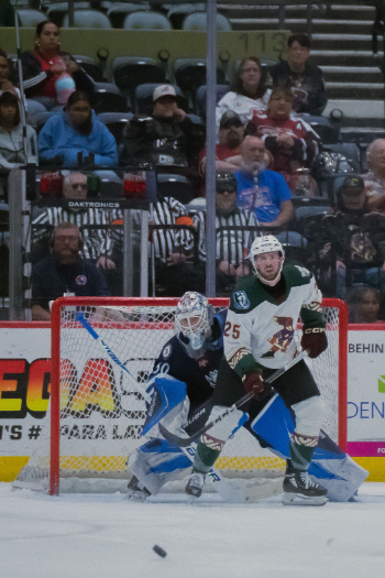 Moose netminder Domenic DiVincentiis peeks around screen of Sammy Walker of Tucson – Photo by Max Williamson