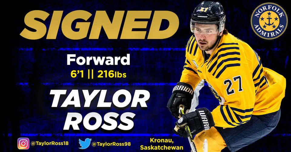 NORFOLK, VA — The Norfolk Admirals, proud members of the ECHL, announced on Friday they have officially re-signed forward Taylor Ross to a contract for the upcoming season.