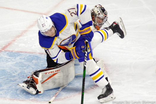 Carter Hutton made 21 saves to help the Sabres to their first win of the season.