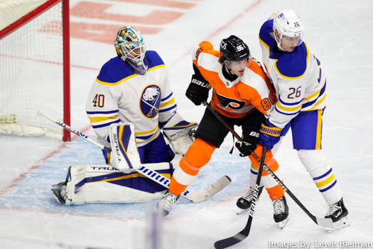 Michael Raffl #12 of the Philadelphia Flyers attempts to screen Carter Hutton #40 of the Buffalo Sabres