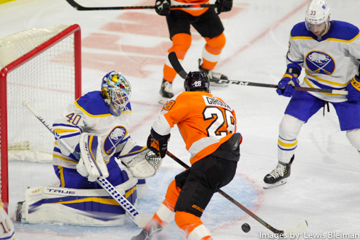 Claude Giroux #28 of the Philadelphia Flyers attempts to score against Carter Hutton #40 of the Buffalo Sabres