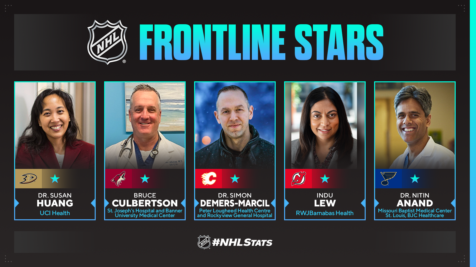 NEW YORK – Throughout the 2020-21 regular season the NHL has been celebrating the remarkable efforts of the off-ice stars who have made it possible for us to play our games amid a pandemic by honoring frontline healthcare heroes from the regions represented by the League’s weekly and monthly “Stars.” Players winning the NHL’s First Star of the Week, First Star of the Month and Rookie of the Month awards have shared those honors with frontline healthcare heroes from their teams’ communities.
